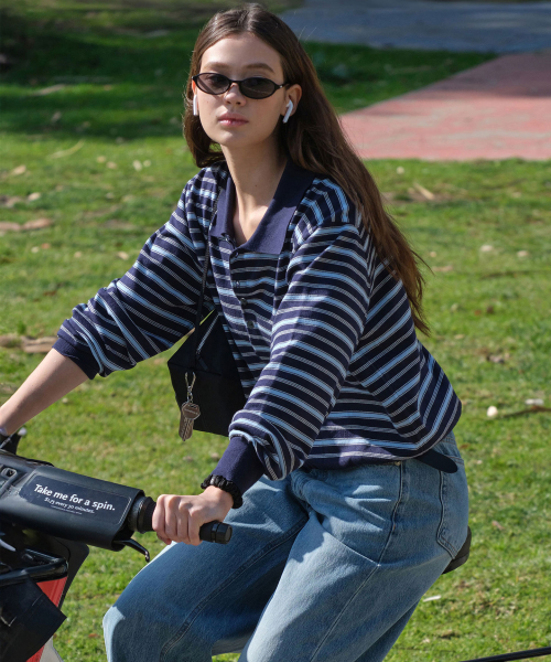 STRIPED OPEN COLLAR SWEATER_NAVY STRIPE [LC261KN04NS]