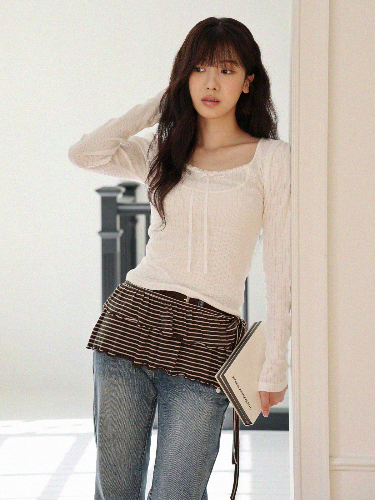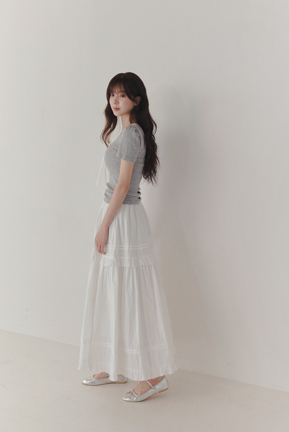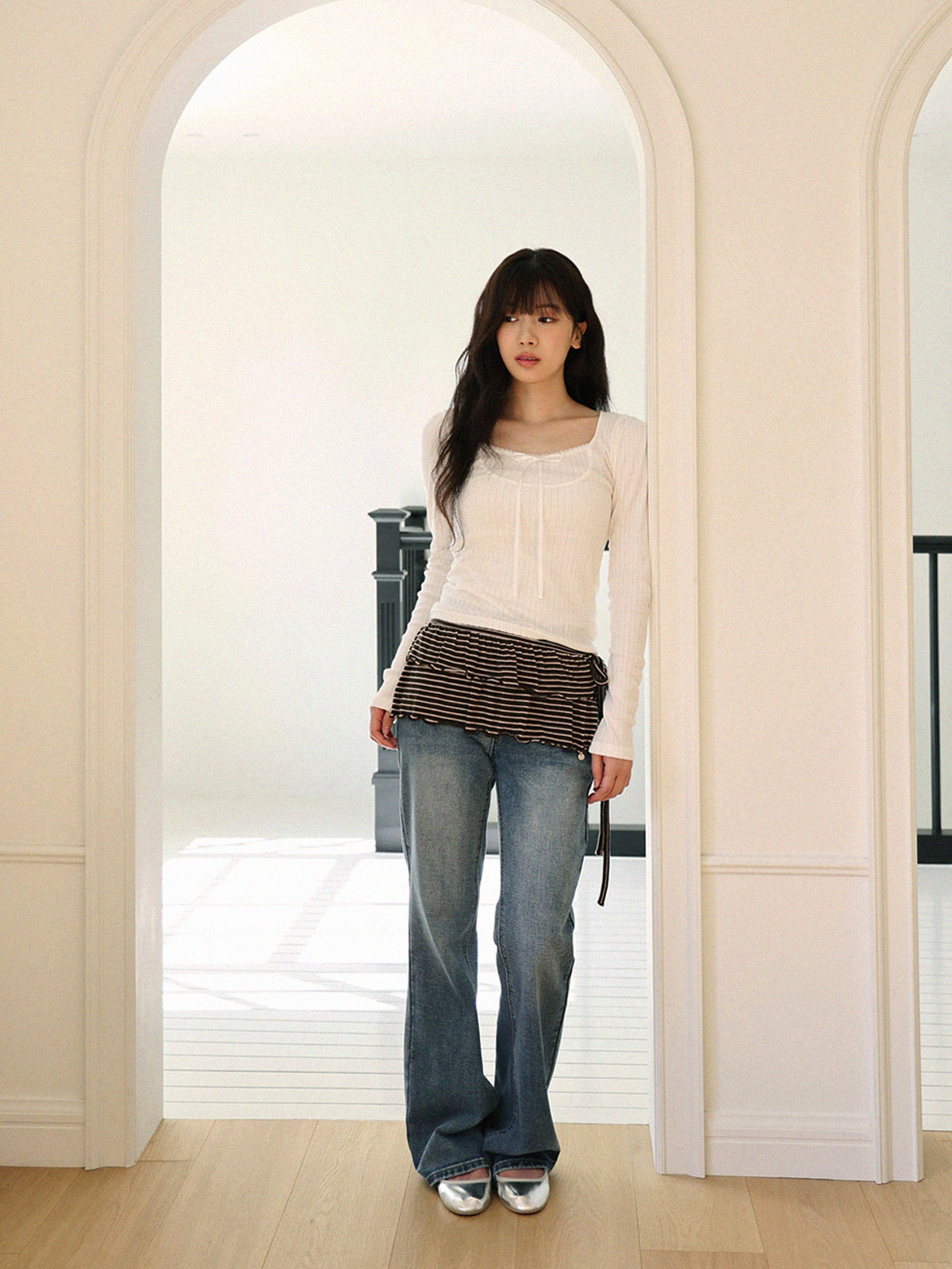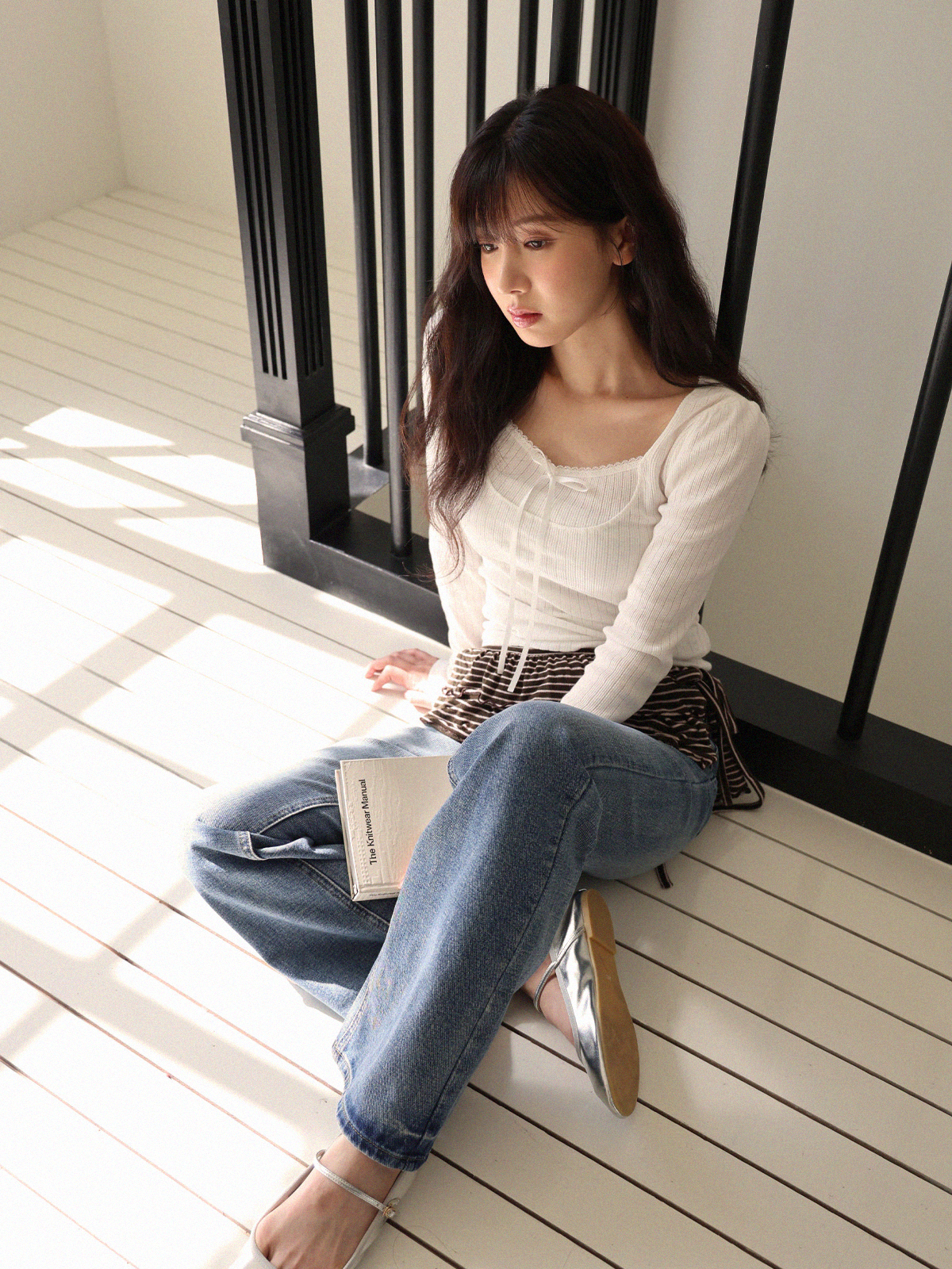 바디에 슬림하게 핏 되는 차들한 실루엣에 센터 타이 디테일은 취향따라 다양하게 연출가능하며 여리해보이면서도 페미닌한 무드로 즐기기 좋습니다 |