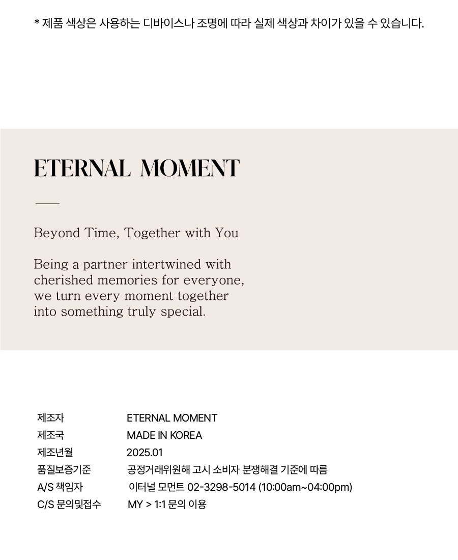 이터널 모먼트(ETERNAL MOMENT)는 모두의 소중한 추억과 함께하는 동반자로서, 함께하는 모든 순간을 특별한 경험으로 만드는 브랜드입니다.