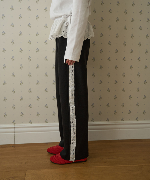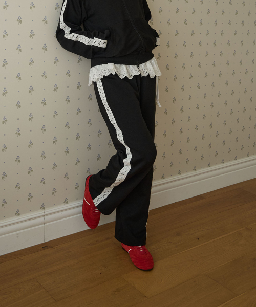 사이드 코튼 펀칭 레이스 와이드 스웻팬츠 블랙