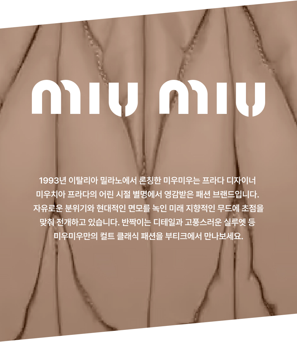 MIU MIU(미우미우)는 프라다보다 밝고 경쾌한 색상 사용과 실험적인 디자인이 특징인 여성 의류 및 악세서리를 선보이는 브랜드입니다.