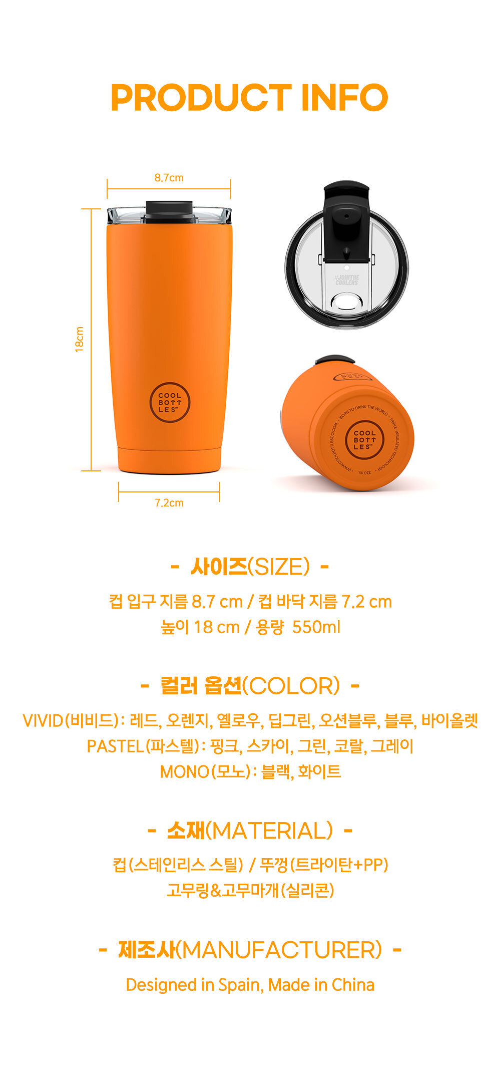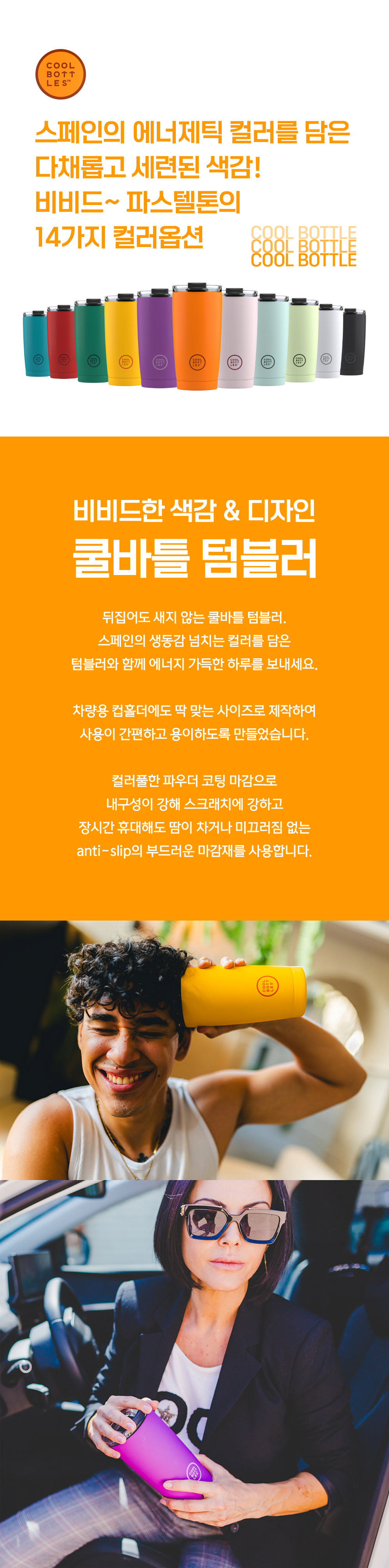 쿨바틀(COOLBOTTLES)는 스페인의 아름다운 지중해 해변이 있는 알리칸테에서 시작된 브랜드입니다. 스페인의 정열적인 무드를 닮은 컬러풀한 색상과 디자인으로, 단순한 물병이 아닌 패션 아이템으로 인식되고 사용할 수 있도록 새로운 라이프 스타일을 제안합니다.