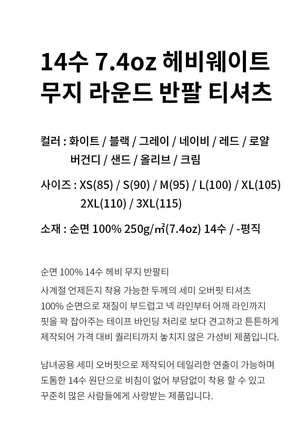 14수 7.4oz 헤비웨이트 라운드 오버핏 무지 반팔 티셔츠 - 10 COLOR