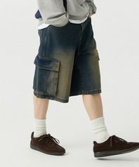[M~4XL] 카고 포켓 버뮤다 데님 팬츠_빈티지 블루