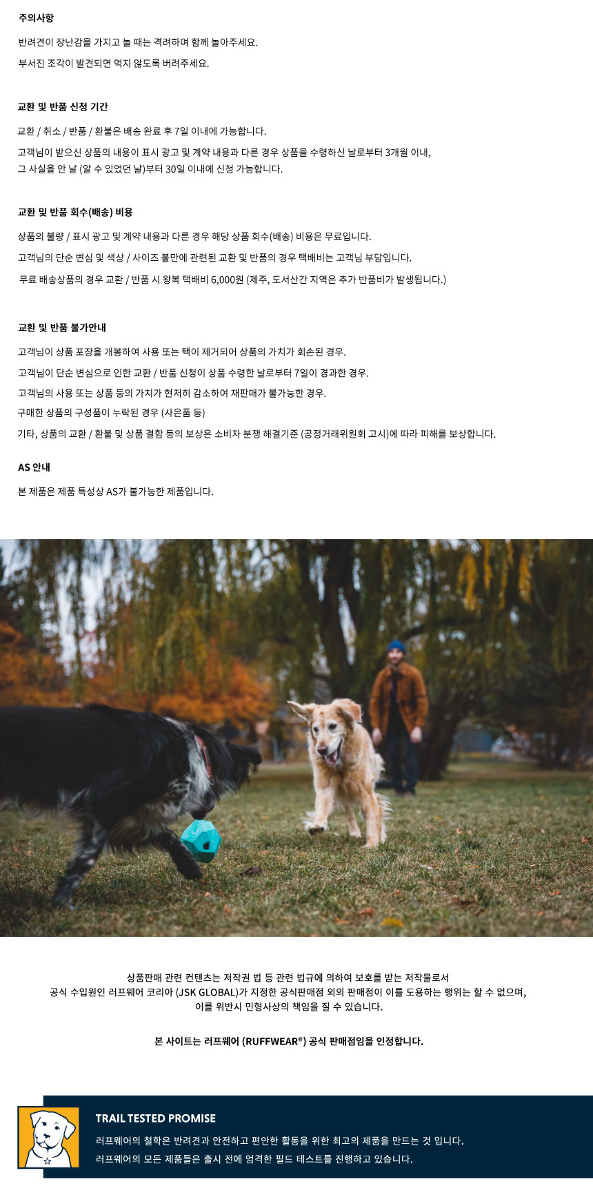 러프웨어(RUFFWEAR)는 그 이름만으로도 애견용품을 대표하는 최고급 브랜드로 미국 오리건주 밴드에 위치했습니다. 러프웨어의 철학은 개와 사람이 동료애를 느끼며 아웃도어 활동을 안전하고 편안하게 할 수 있는 최고급 아웃도어 애견용품을 만드는 것이며, 이를 위해 제품의 디자인, 소재를 그 목적에 맞게 설계/제작하고 있으며 지속적인 제품 개발을 통해 최고의 애견용품 업체로의 위상을 굳건해 하고 있습니다.