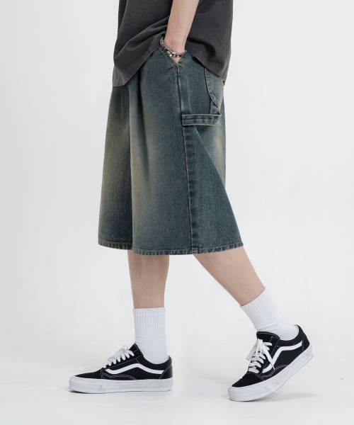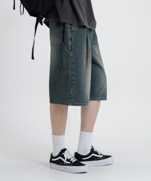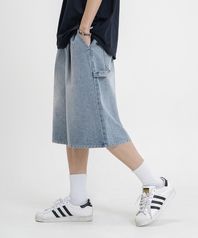 버뮤다 와이드 원턱 카펜터 데님 밴딩 쇼츠 [연청]