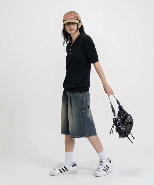 버뮤다 와이드 원턱 데님 밴딩 쇼츠 [흑청]