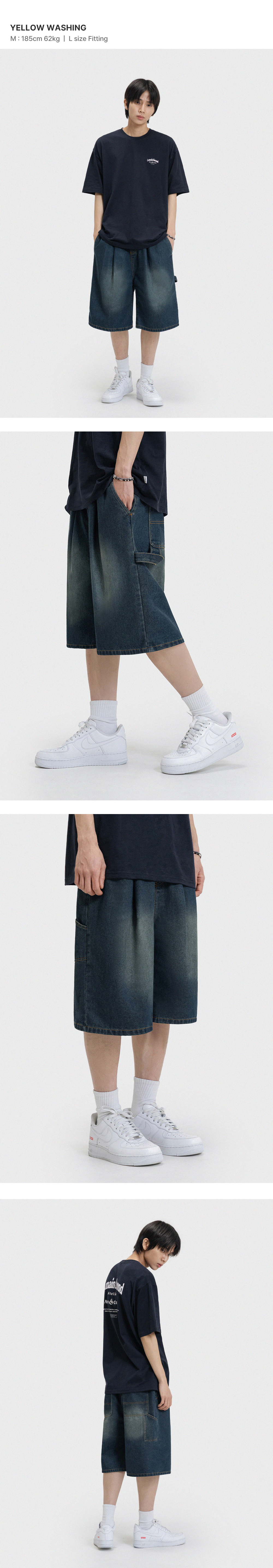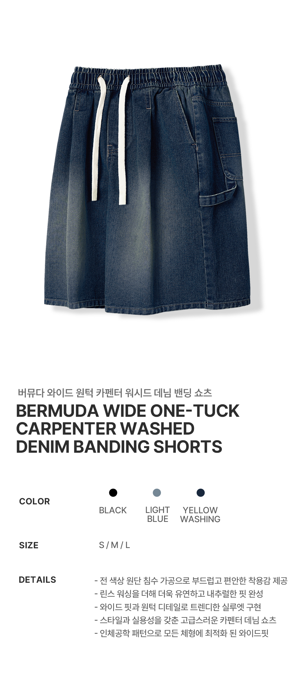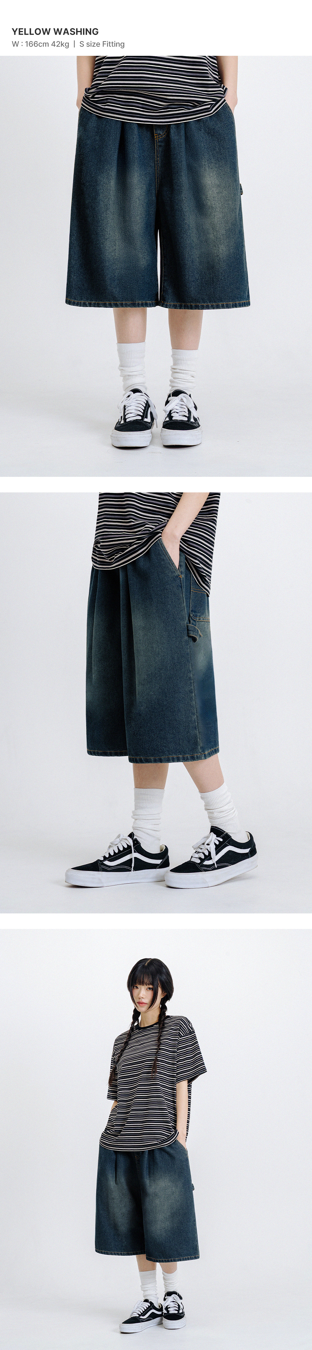 버뮤다 와이드 원턱 카펜터 워시드 데님 밴딩 쇼츠 [옐로우 워싱]