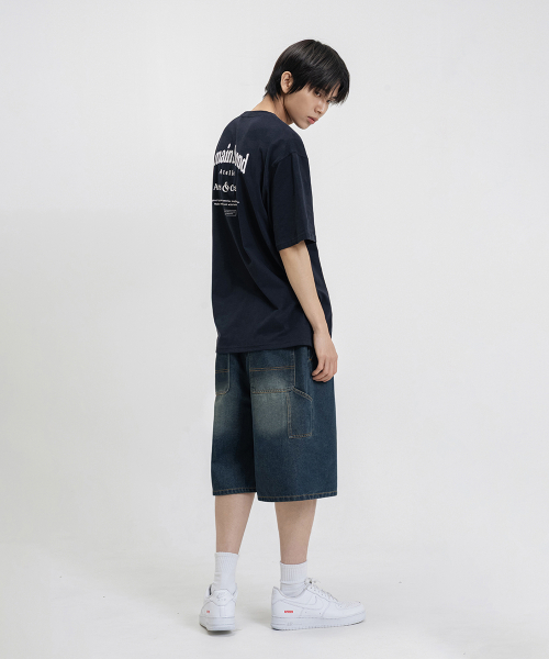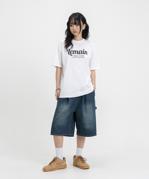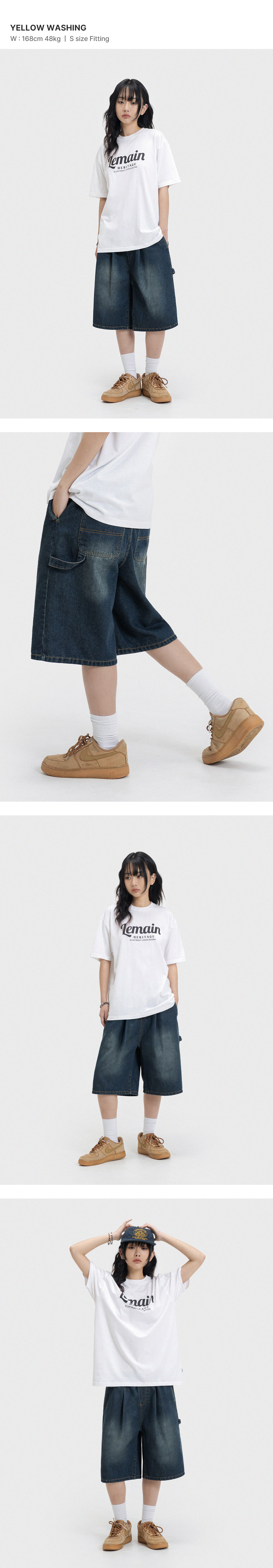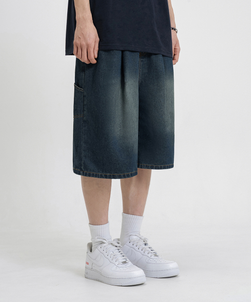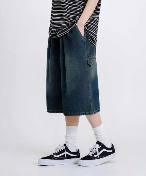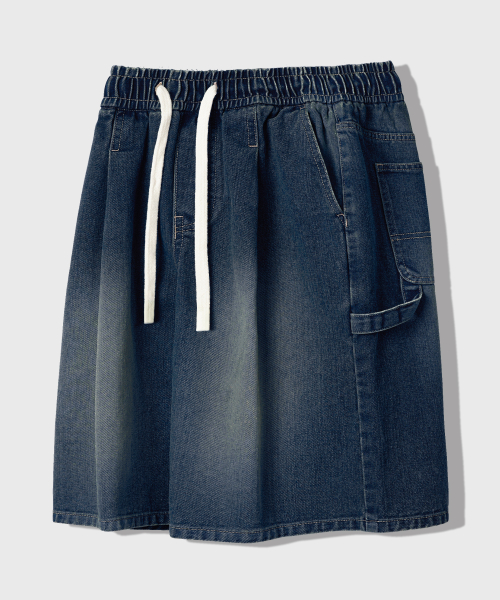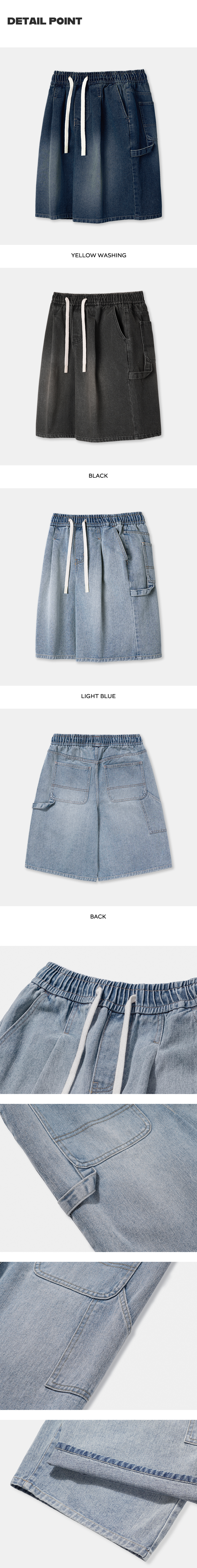 버뮤다 와이드 원턱 카펜터 워시드 데님 밴딩 쇼츠 [옐로우 워싱]