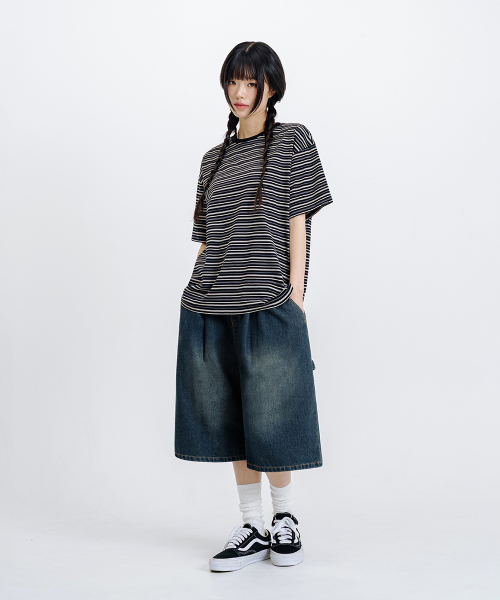 버뮤다 와이드 원턱 데님 밴딩 쇼츠 [흑청]