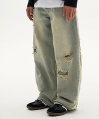 빈티지 워시드 데미지 패치 디테일 와이드 데님 팬츠 [연청]