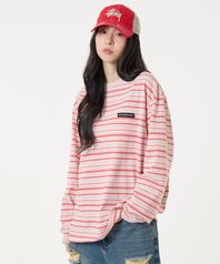아이비 멀티 스트라이프 라운드 롱슬리브 티셔츠 코럴핑크