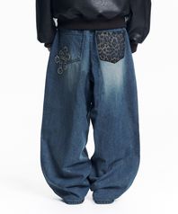 레오파드 크로스 패치 롤업 데님 팬츠 - 딥블루