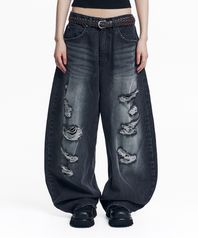 디스트로이드 커브드 데님 팬츠 - 블랙