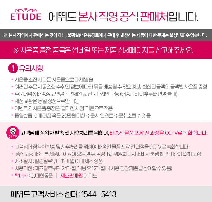 에뛰드(ETUDE)는 달콤한 일상을 꿈꾸는 모든 이들의 친구이고자 합니다. 나만의 아름다움을 발견하고 예뻐지는 달콤한 상상이 현실이 되는 것을 추구하며, 다양하고 감각적인 컬러를 고르는 즐거움과 웃음이 터질 만큼 유쾌한 제품을 만나는 설렘을 선사하여 일상을 달콤하게 빛내고자 합니다.