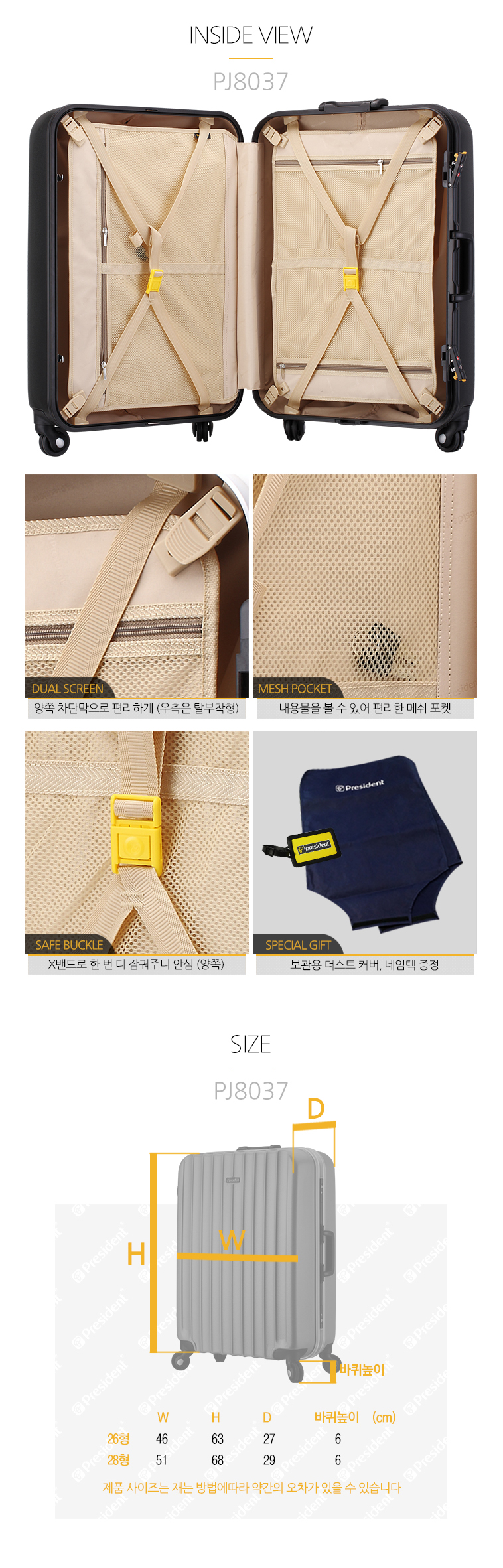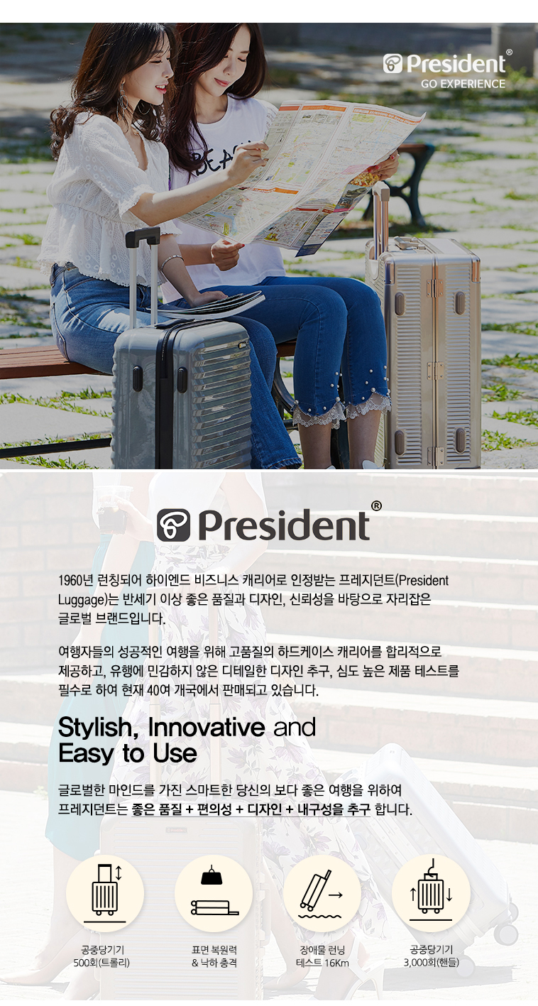 프레지던트(PRESIDENT)는 1960년 일본에서 론칭한 캐리어 브랜드입니다. 여행자들의 성공적인 여행을 위해 고품질의 제품을 합리적인 가격으로 제공하며, 강도 높은 제품 테스트를 진행합니다. '프레임' 캐리어를 전문적으로 취급하며, 좋은 품질과 디테일한 디자인, 신뢰를 바탕으로 전 세계 40여개 국에서 판매하고 있습니다.
