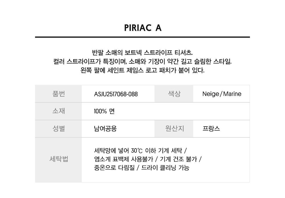 세인트제임스(SAINT JAMES)는 1889년 프랑스 노르망디 몽생미셸만 근처 세인트제임스 지역에서 시작되었습니다. 직접 만들고 염색한 털실 판매를 시작으로, 직접 만든 울로 레옹 지방 어부들을 위한 셔츠를 공급하며 1929년 회사를 설립하였고, 이후 마린 룩의 대명사로 성장하였습니다.