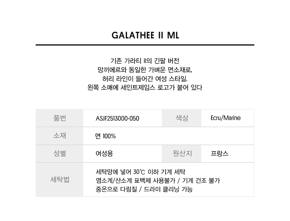 세인트제임스(SAINT JAMES)는 1889년 프랑스 노르망디 몽생미셸만 근처 세인트제임스 지역에서 시작되었습니다. 직접 만들고 염색한 털실 판매를 시작으로, 직접 만든 울로 레옹 지방 어부들을 위한 셔츠를 공급하며 1929년 회사를 설립하였고, 이후 마린 룩의 대명사로 성장하였습니다.