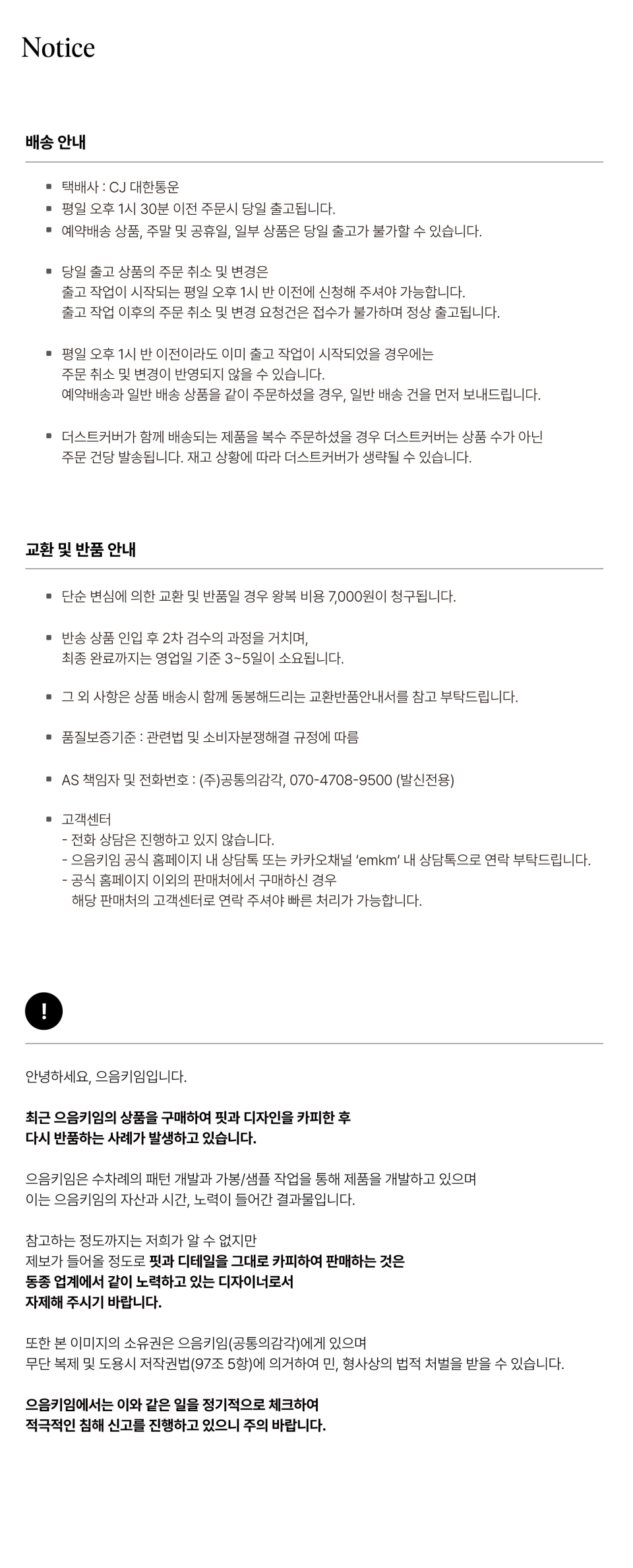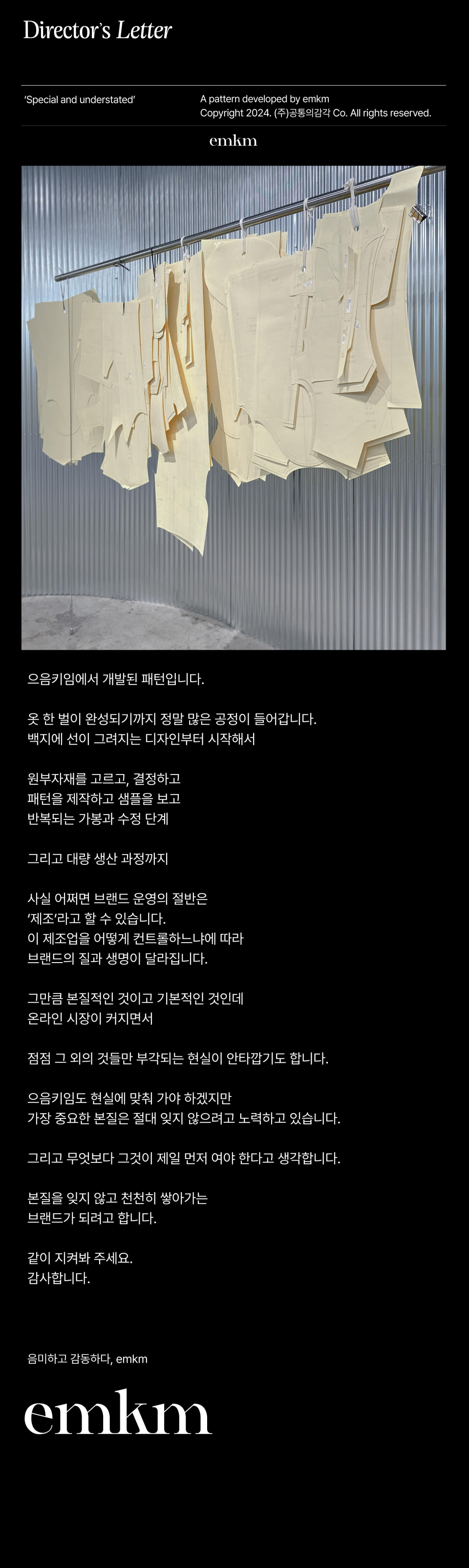 으음키임(EMKM)은 무언가를 음미하고 감상할 때 나오는 의성어인 '으음-'에서 시작된 말로, '음미하고 감동하다'라는 의미를 담고 있습니다. 오버 핏 아우터와 탑, 데님의 3피스를 중심으로 아이템을 전개하며, 특별하면서도 결코 과하지 않은 절제된 디테일의 디자인을 추구합니다.