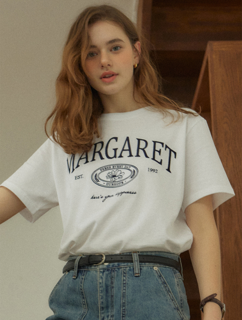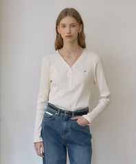 로고 브이넥 버튼 슬리브 티셔츠 - Cream