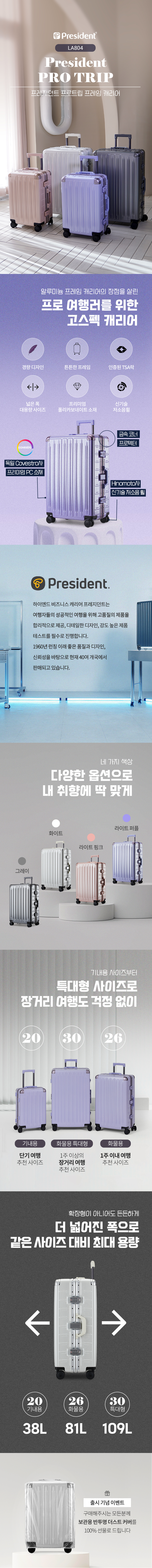 프레지던트(PRESIDENT)는 1960년 일본에서 론칭한 캐리어 브랜드입니다. 여행자들의 성공적인 여행을 위해 고품질의 제품을 합리적인 가격으로 제공하며, 강도 높은 제품 테스트를 진행합니다. '프레임' 캐리어를 전문적으로 취급하며, 좋은 품질과 디테일한 디자인, 신뢰를 바탕으로 전 세계 40여개 국에서 판매하고 있습니다.