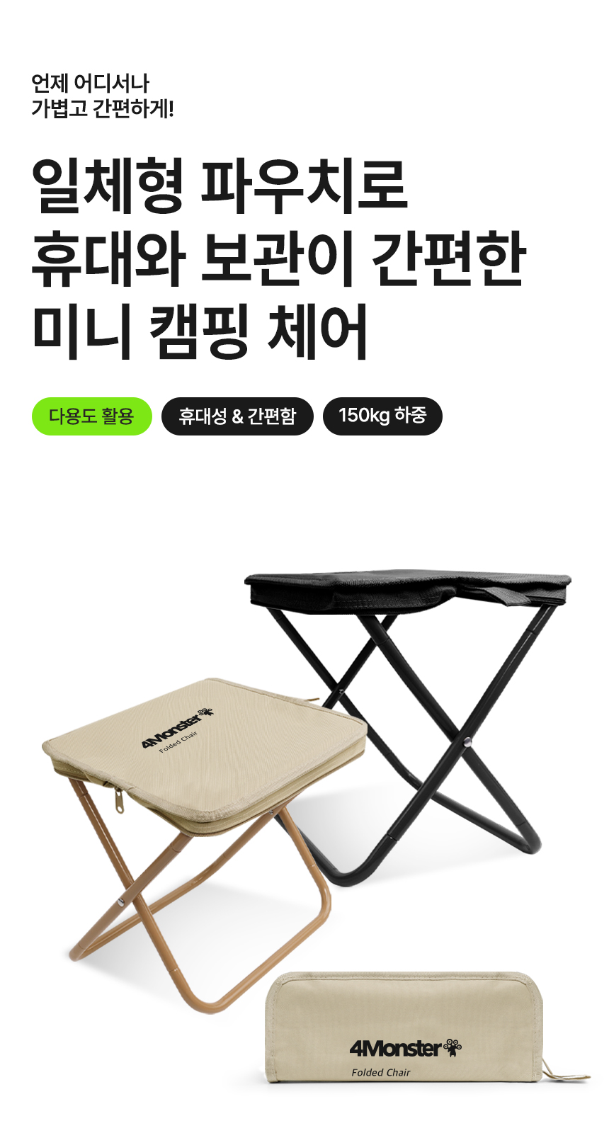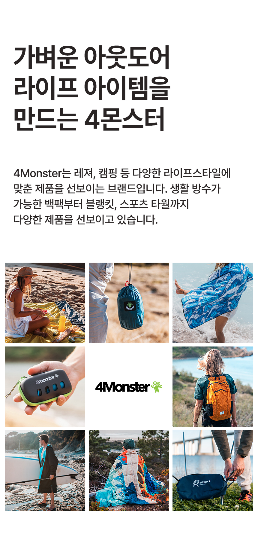 4몬스터(4MONSTER)는 ‘Ultra Light, Portable, Ready to Go’를 모토로, 당신의 가벼운 일상을 위해 남녀노소 누구나 즐길 수 있는 레저&아웃도어 라이프스타일 아이템을 선보입니다.