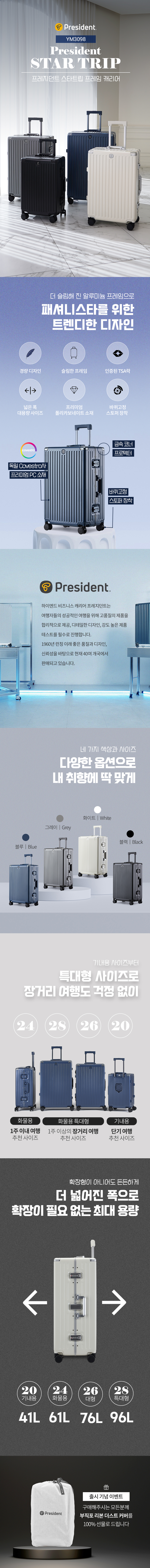 프레지던트(PRESIDENT)는 1960년 일본에서 론칭한 캐리어 브랜드입니다. 여행자들의 성공적인 여행을 위해 고품질의 제품을 합리적인 가격으로 제공하며, 강도 높은 제품 테스트를 진행합니다. '프레임' 캐리어를 전문적으로 취급하며, 좋은 품질과 디테일한 디자인, 신뢰를 바탕으로 전 세계 40여개 국에서 판매하고 있습니다.