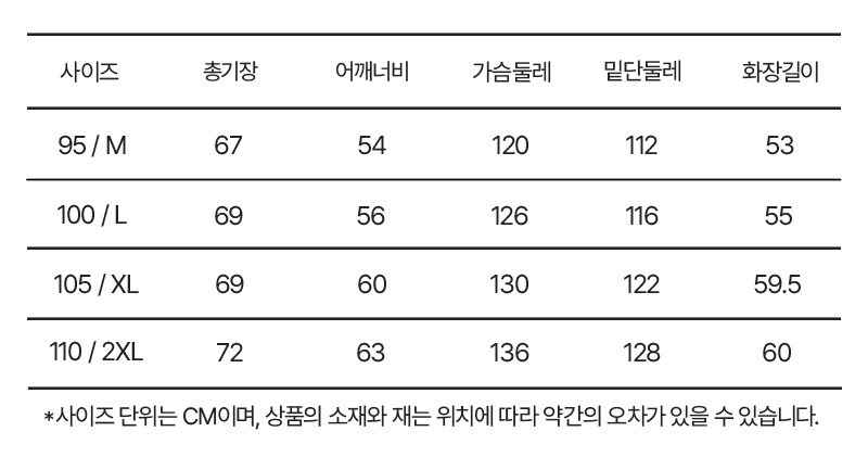 | 치수 | 095,100,105,110 (입고 시기에 따라 정보가 상이할 수 있어, 수령하신 상품의 라벨을 참고하시기 바랍니다.) |