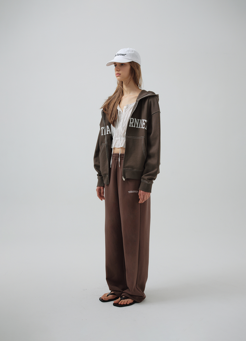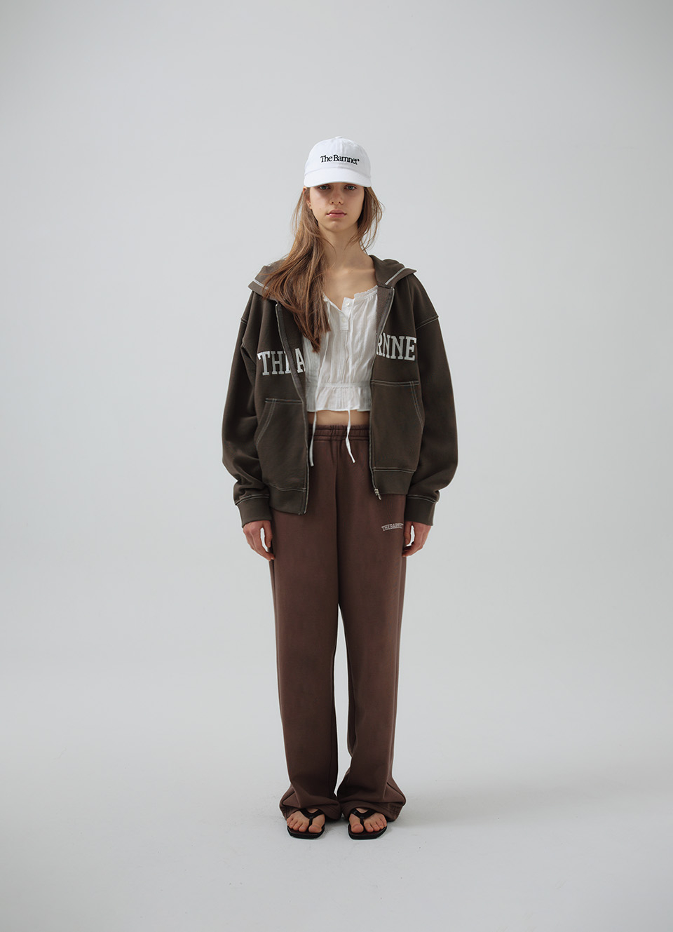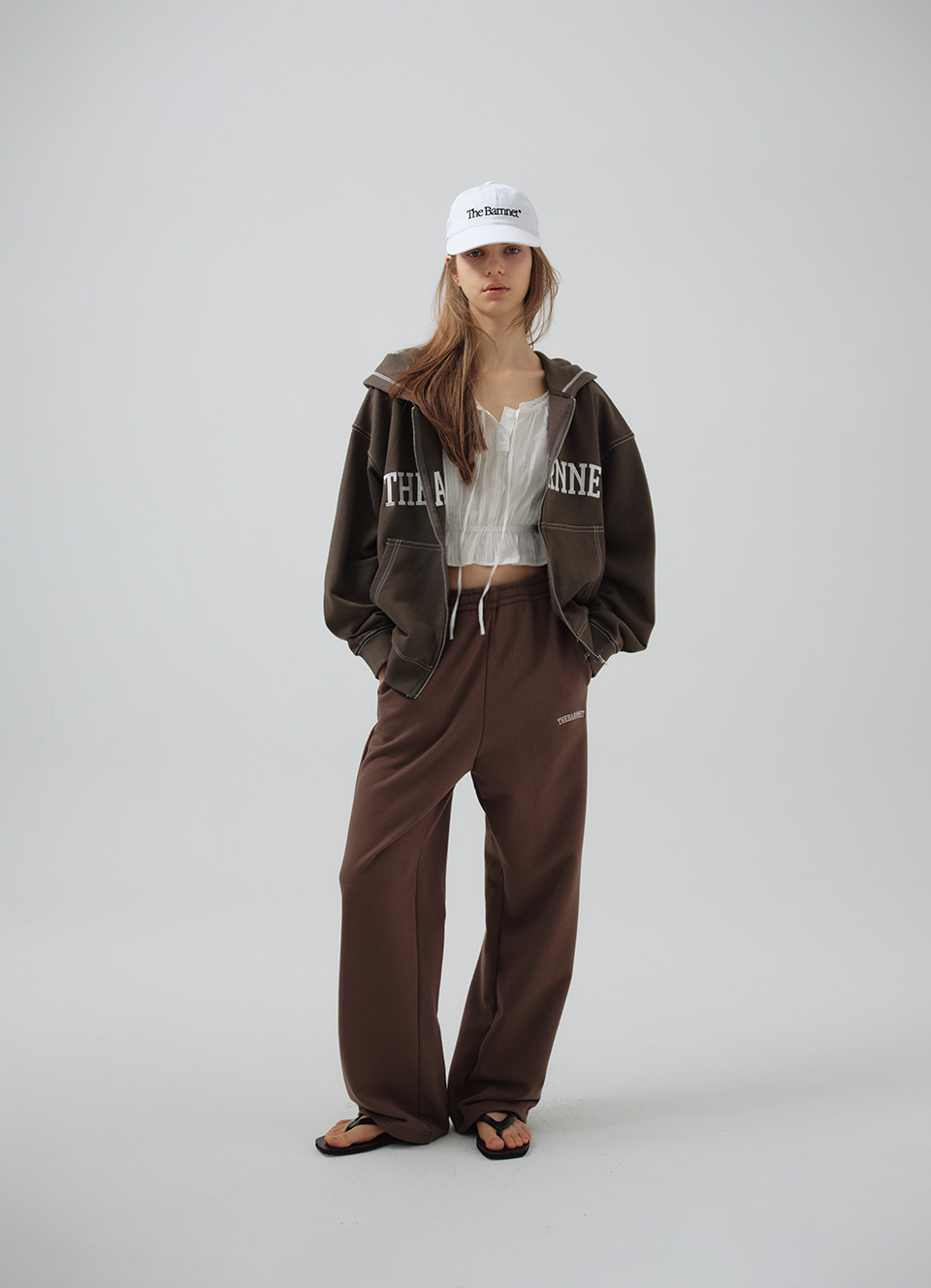 패브릭 컬러와 대비되는 아이보리 스티치 마감과배색 로고 자수 포인트