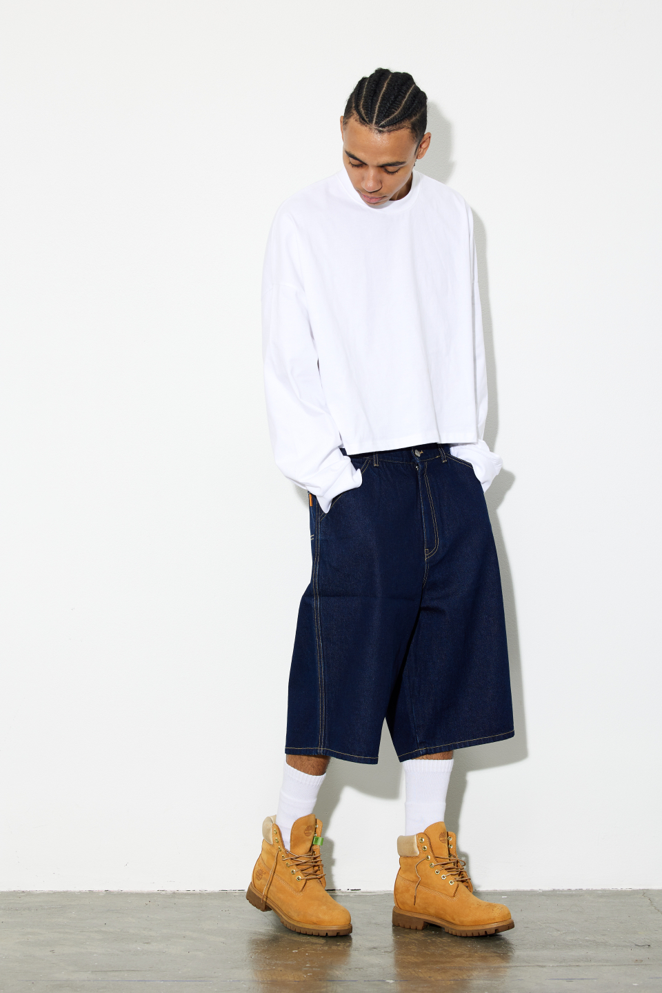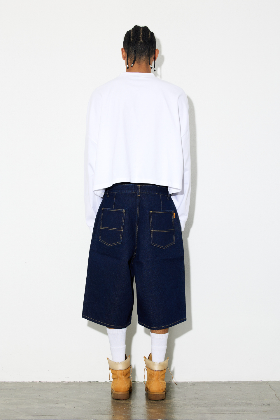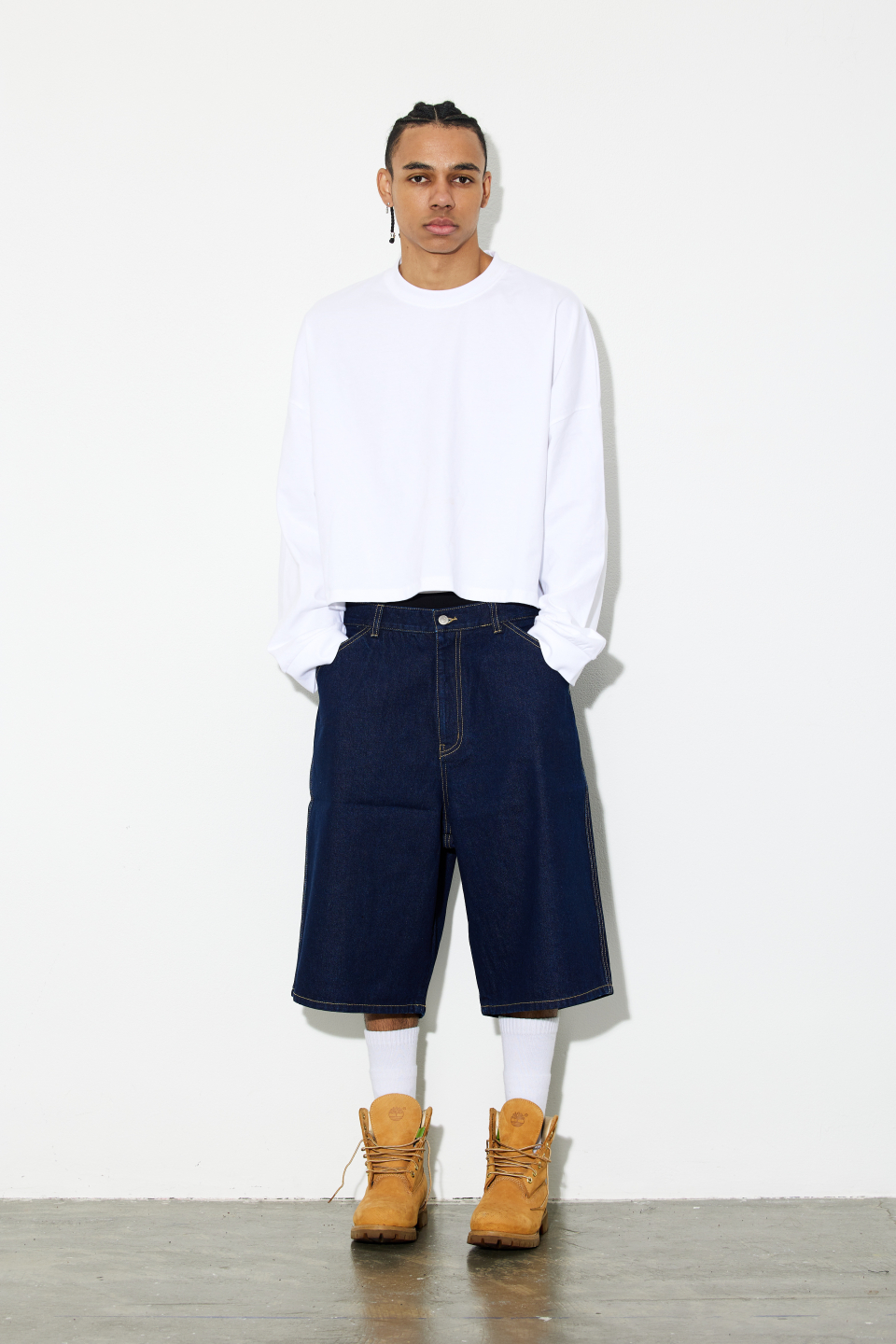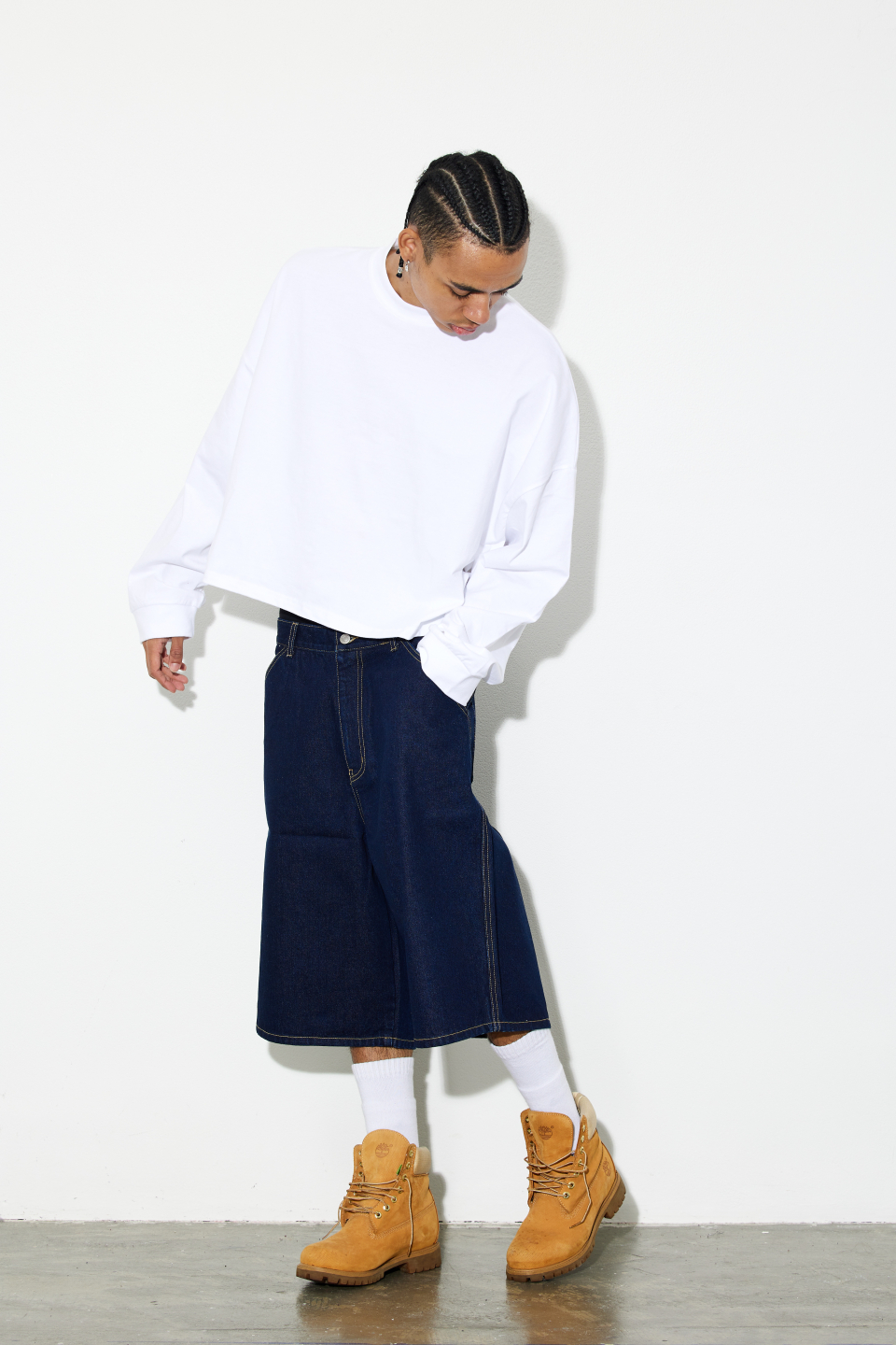 1.정강이가지 내려오는 버뮤다핏의 데님 숏팬츠 입니다.