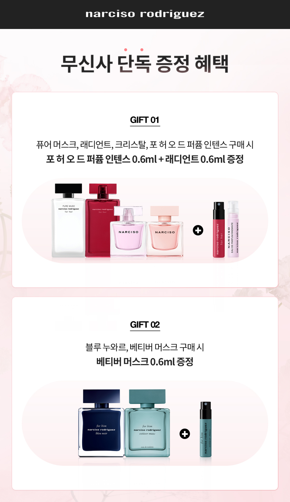 나르시소 로드리게즈(NARCISO RODRIGUEZ)는 뉴요커의 모던한 감각과 감성이 조화를 이루는 매혹적인 향수 브랜드입니다. 미국과 유럽, 남미의 영향을 두루 받아 시간을 초월한 클래식함과 현대적인 우아함을 표현합니다. 여성의 모습과 감정을 섬세하게 담은 탁월한 향기를 만날 수 있습니다.