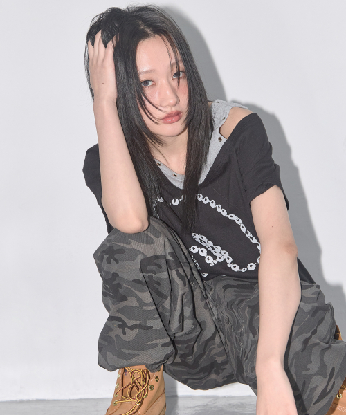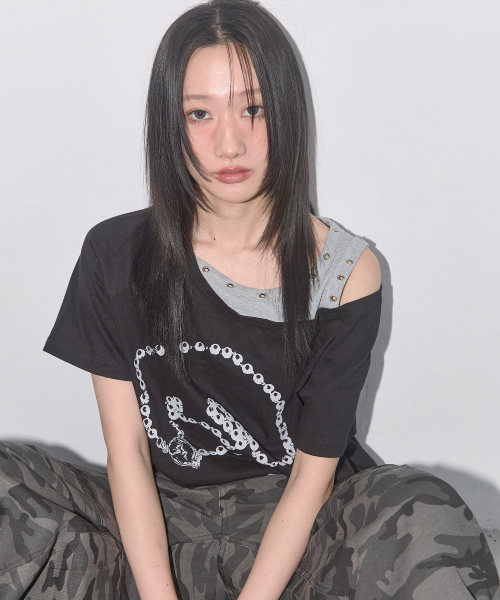 모티프 자수 스트라이프 레이어드 긴팔 티셔츠 BLACK