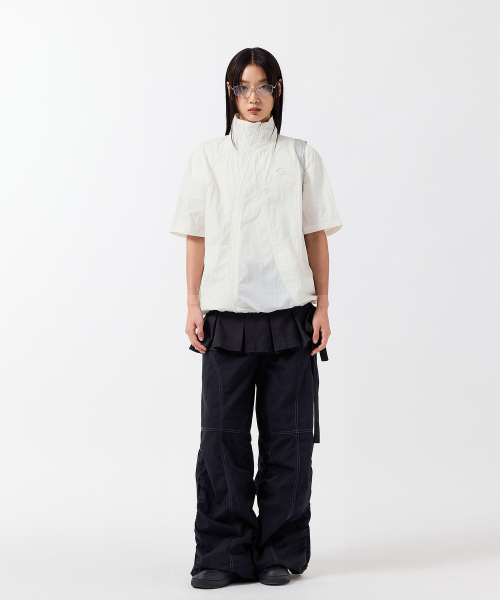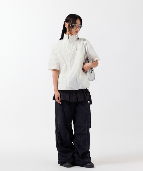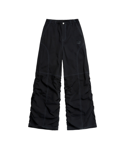 사선 절개 스티치 셔링 팬츠 - BLACK