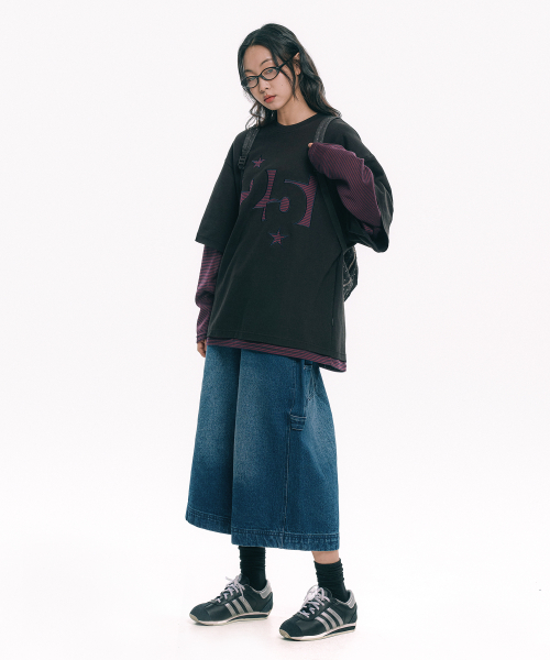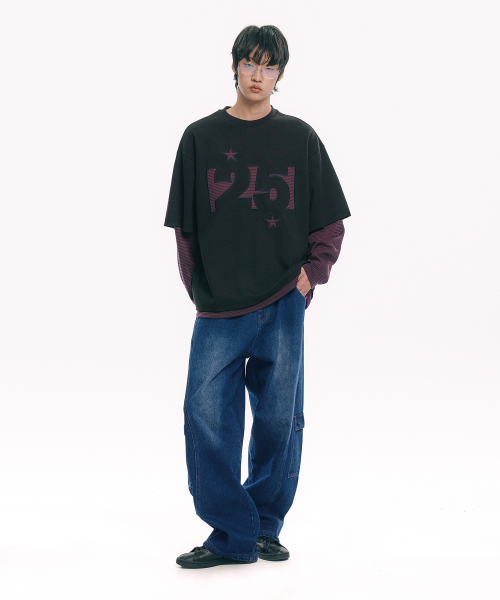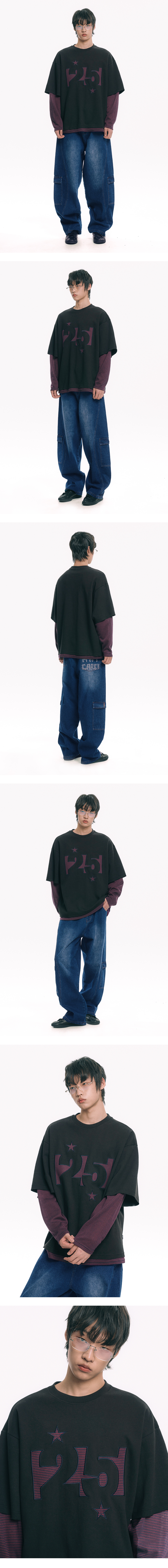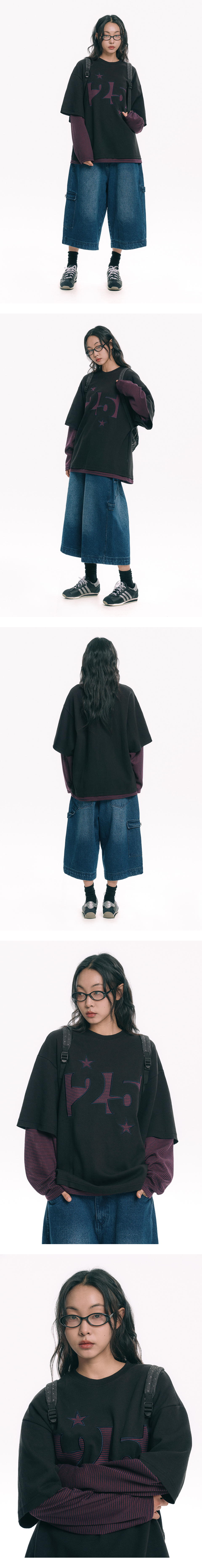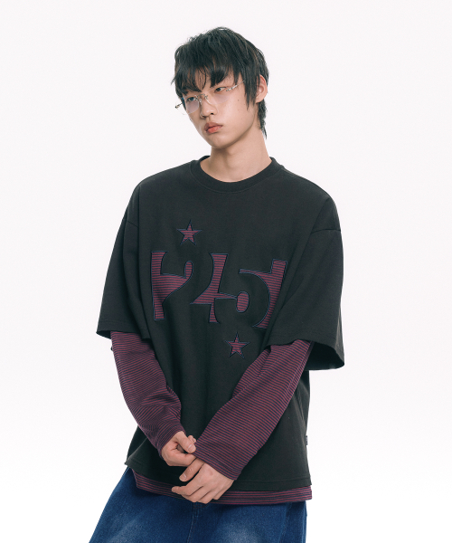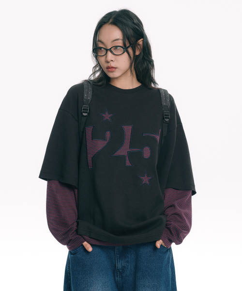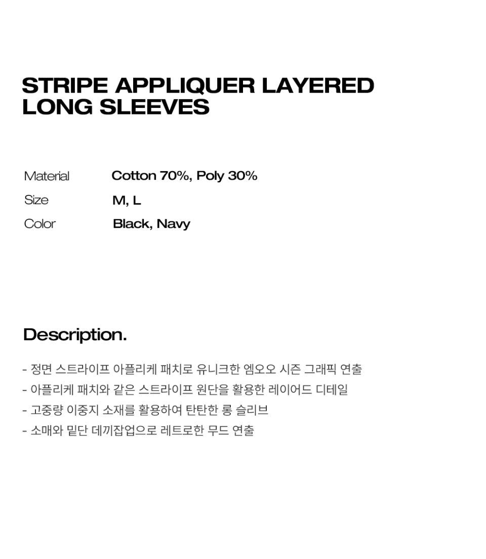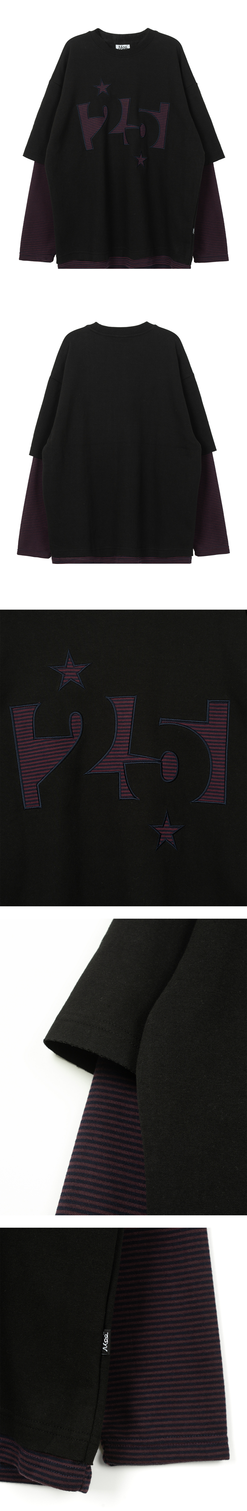 스트라이프 아플리케 레이어드 긴팔티 - 블랙