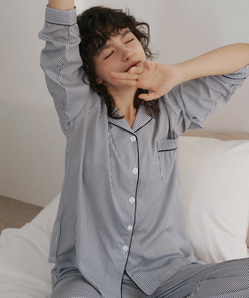 [2PACK] 스트라이프 버터옐로/블루베리/크림소다 반팔 카라 잠옷 상하의 세트
