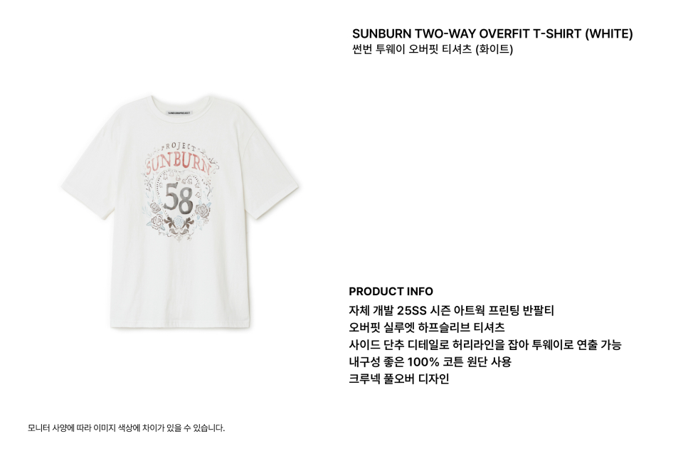 썬번프로젝트(SUNBURNPROJECT)는 태양 아래 오래 머문 듯, 선명하고 생기 있는 무드를 담은 컬렉션을 전개합니다. 분명한 취향과 자신만의 스타일을 지닌 이들에게서 영감을 받아, 편안하지만 감각적인 무드를 제안하는 브랜드입니다.
