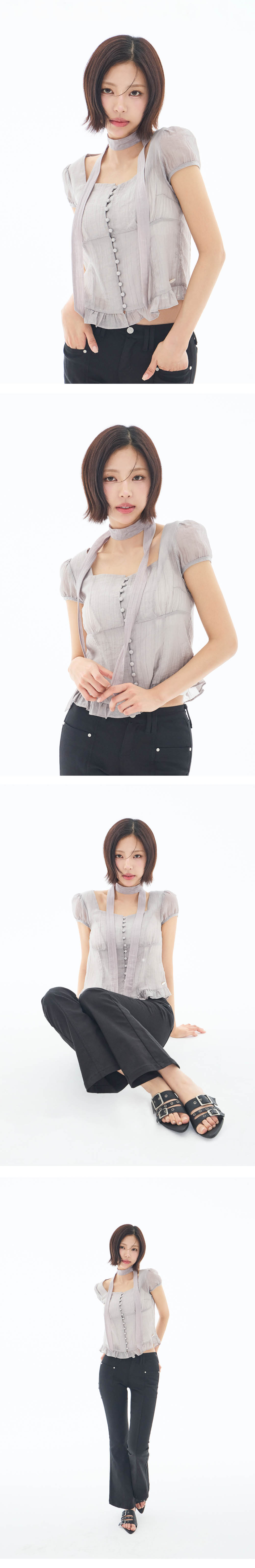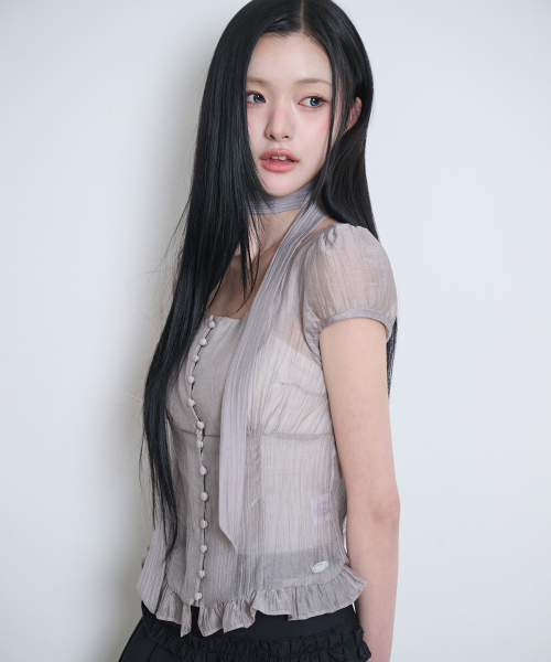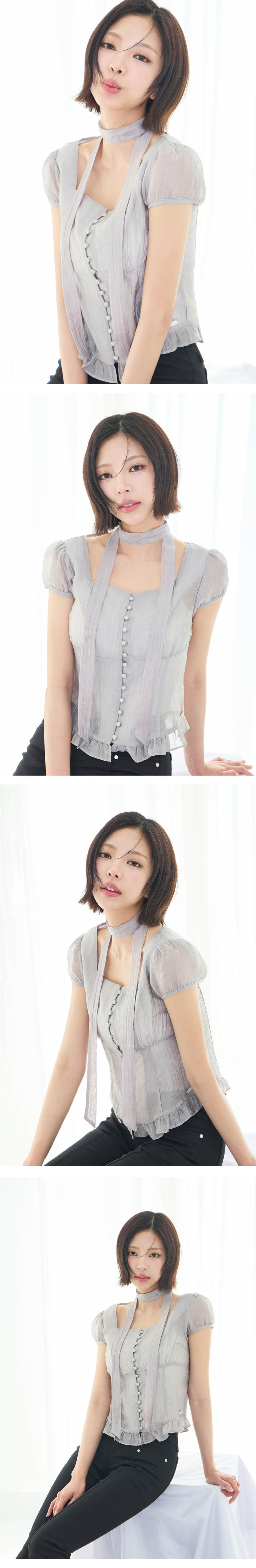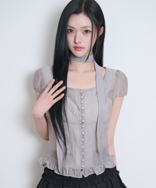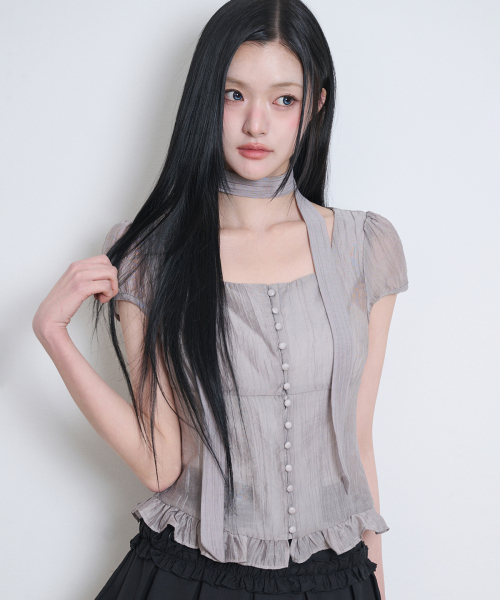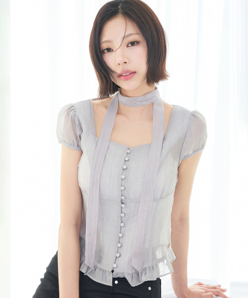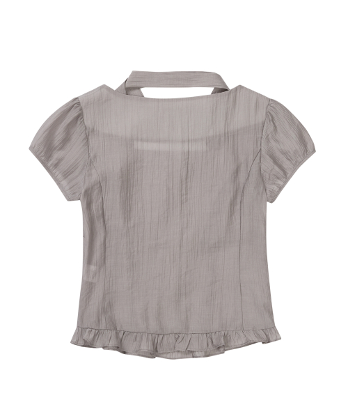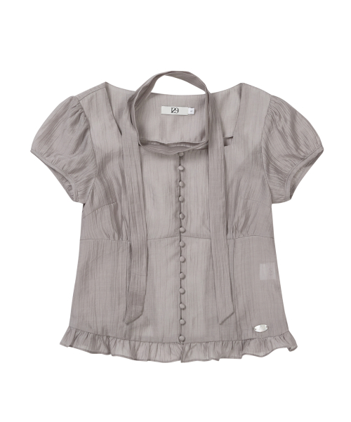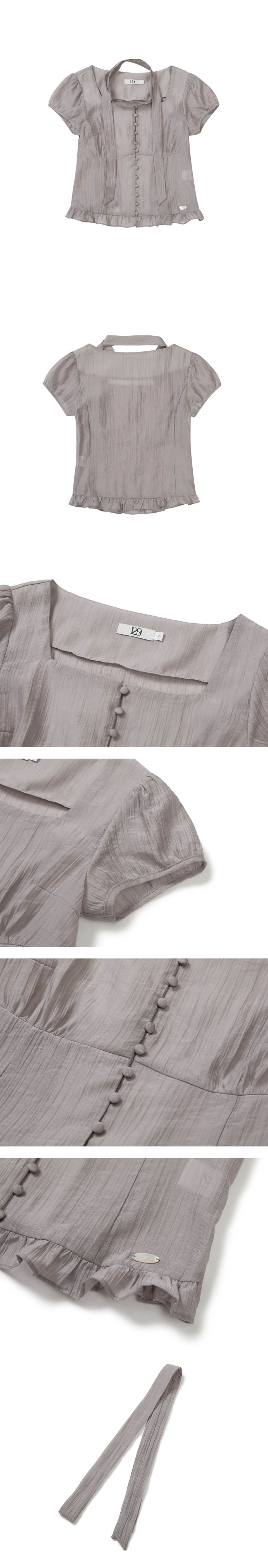 리본 타이 스퀘어넥 블라우스 그레이