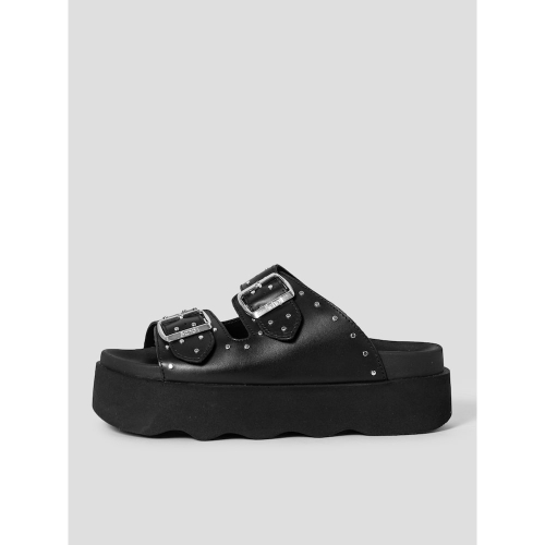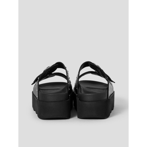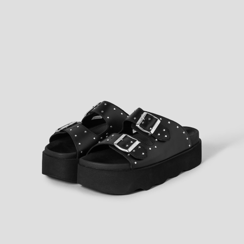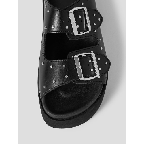여름철 멋스러운 스타일을 연출하기 좋은 가죽 샌들입니다. 두 개의 스트랩과 스터드 장식이 어우러져 트렌디한 무드를 자아내며, 고급스러운 가죽 소재가 세련된 캐주얼룩을 완성합니다. 높은 굽으로 자연스러운 키높이 효과까지 더해 한층 매력적인 연출이 가능하며, 밑창의 물결무늬 디자인이 감각적인 디자인 포인트가 됩니다.
