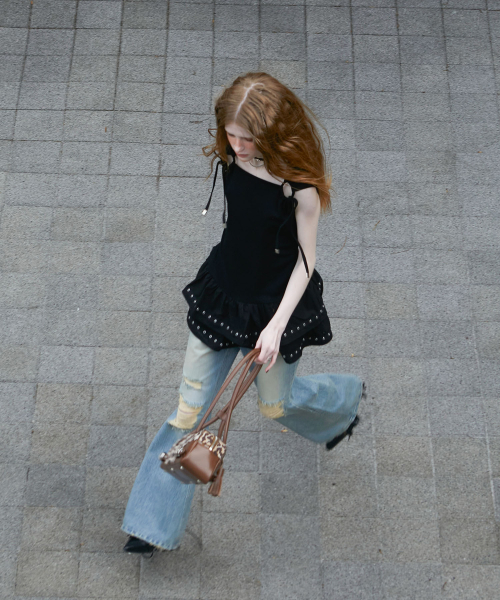 - 여유 있는 라운드 숄더 스트랩은 바디쪽으로 기타 피크모양의 모티브 패널과 메탈 스터드로 포인트를 주었고 메탈 스냅이 있는 비죠로 스트랩 고정이 가능하도록 하였습니다.