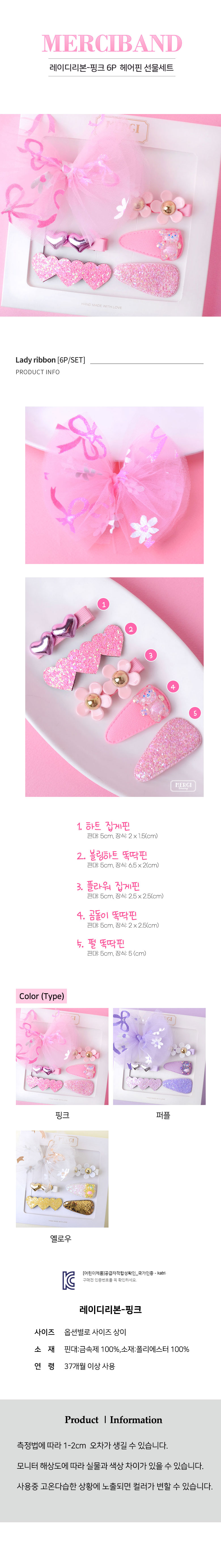 유아동 레이디리본 핑크 헤어핀 선물세트 6P