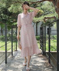 프릴 브이넥 플라워 플리츠 반팔 롱 원피스