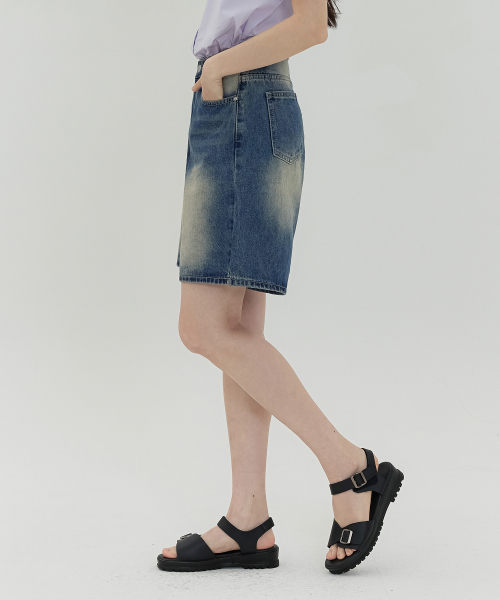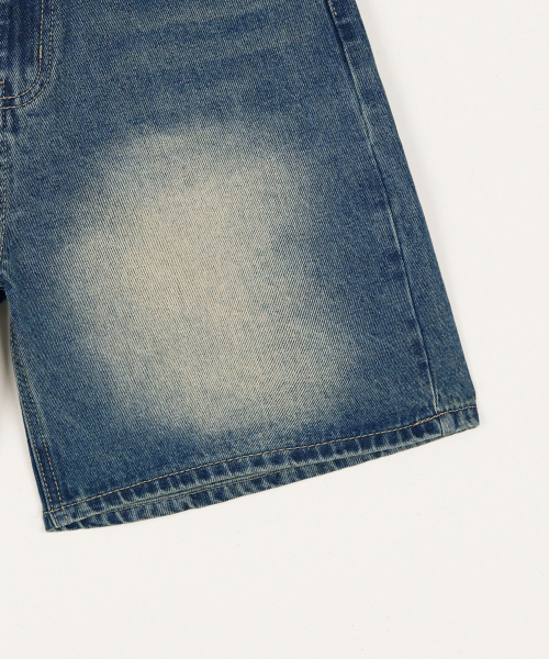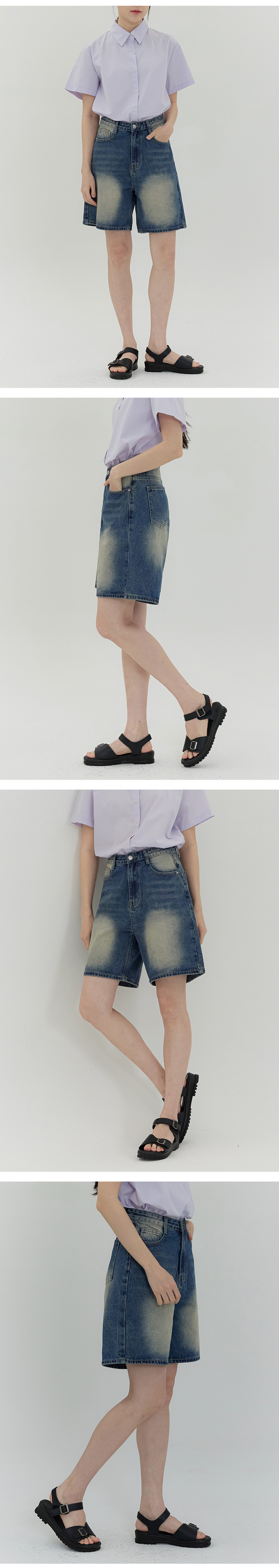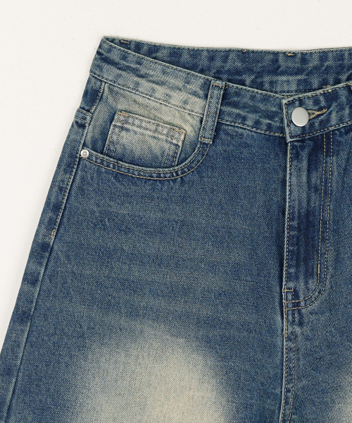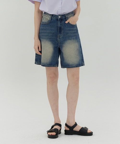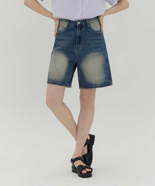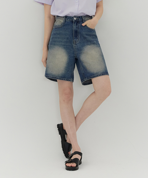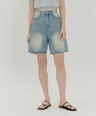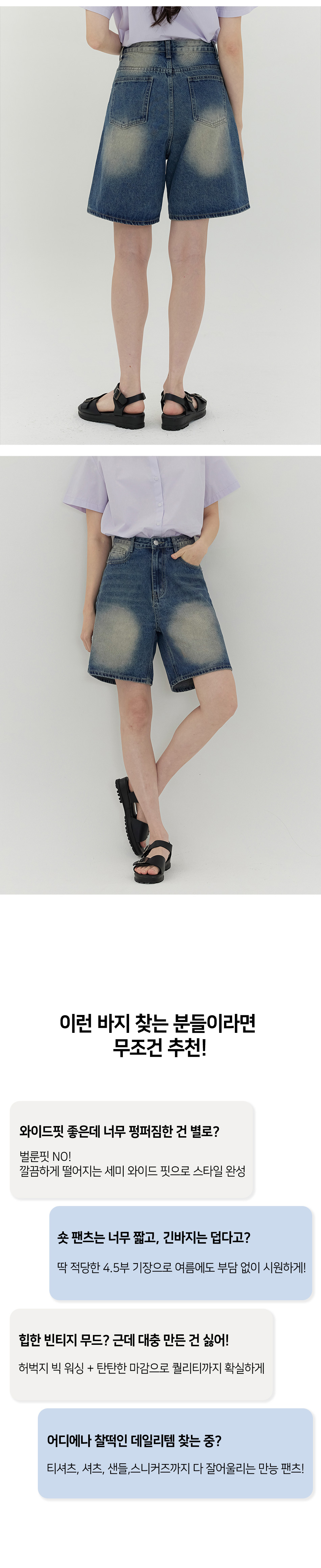 여성 빈티지 워싱 4.5부 와이드 버뮤다 데님 팬츠 (연청)