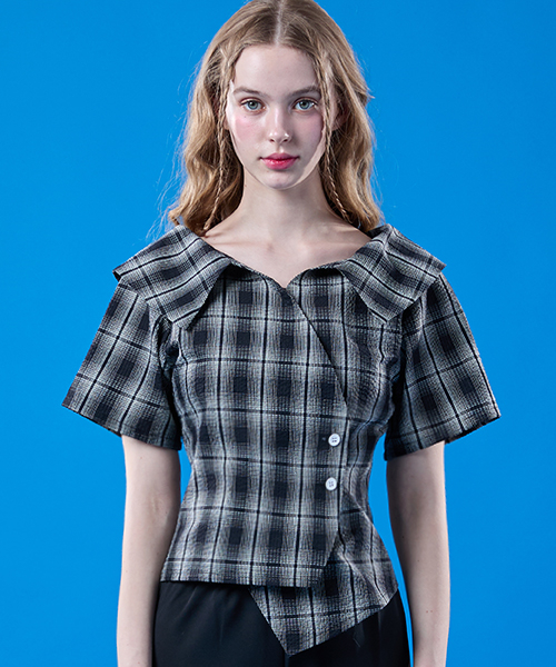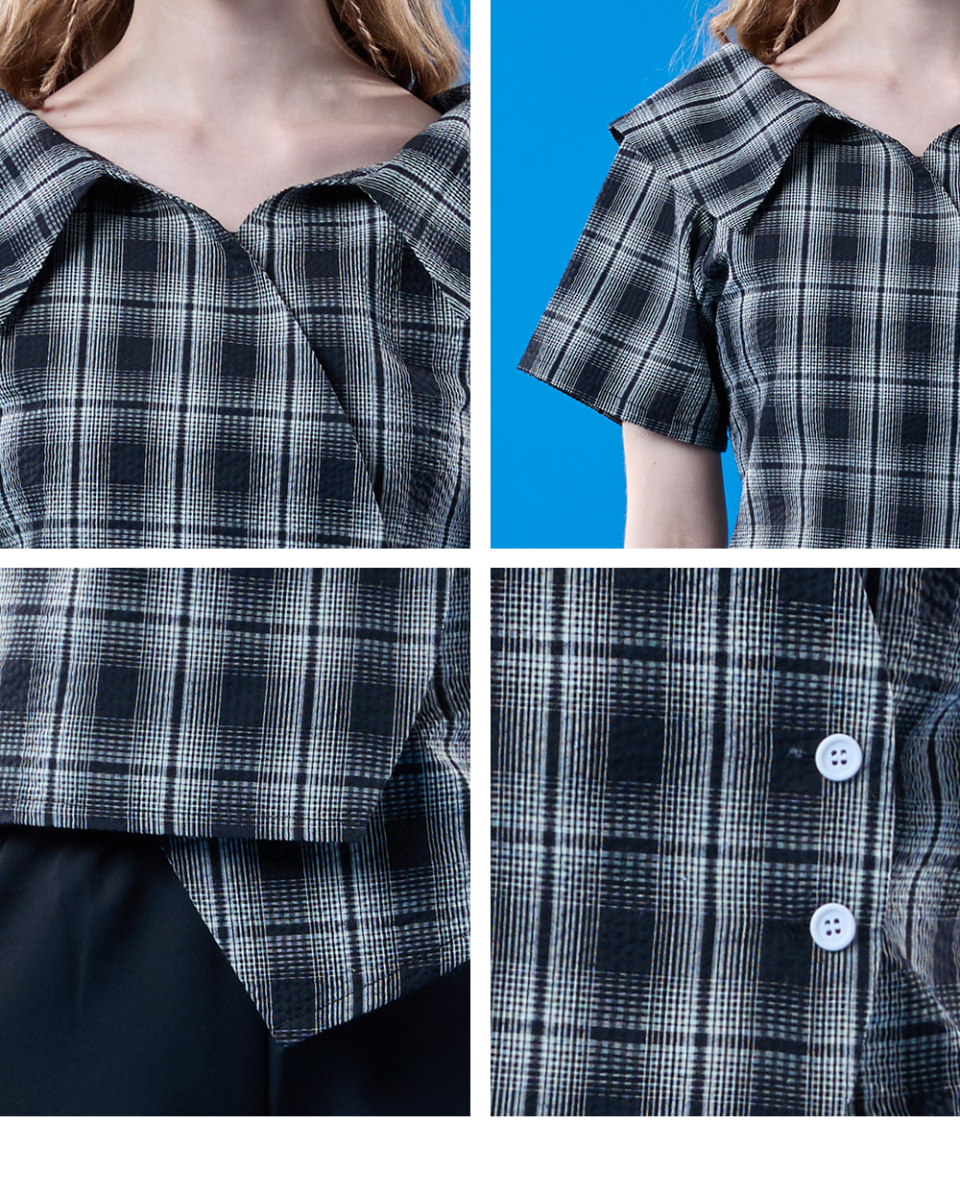 여름 휴양지 랩 오프숄더 체크 쿨링 슬림 반팔셔츠 [BLACK]