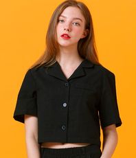 린넨 블랙 슬림 반팔 셔츠 [크롭]