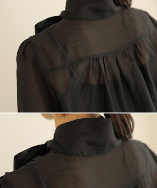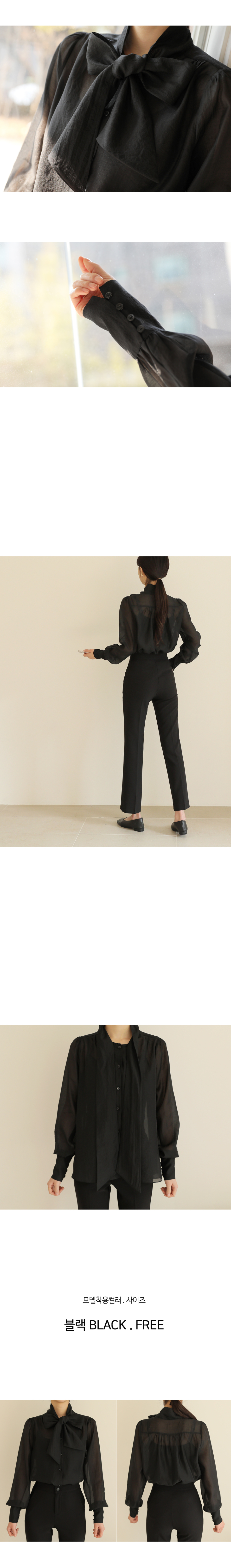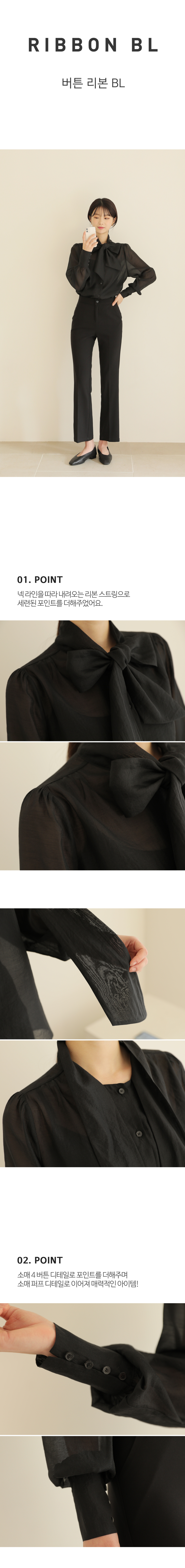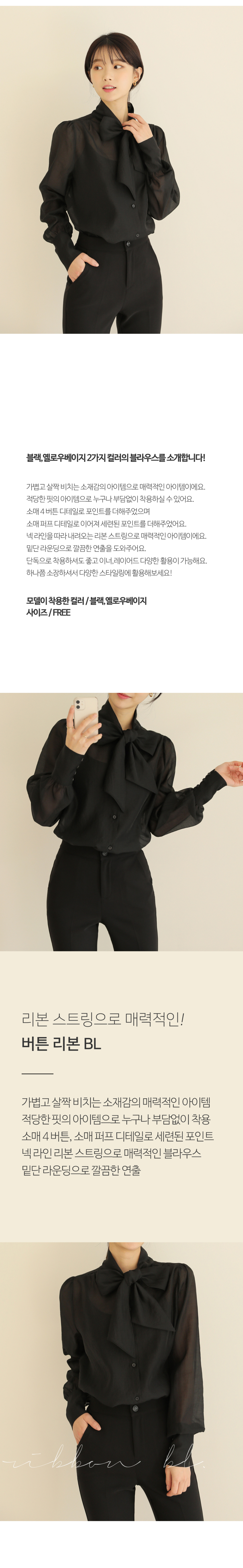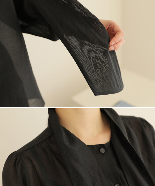 소매버튼 리본 시스루 블라우스