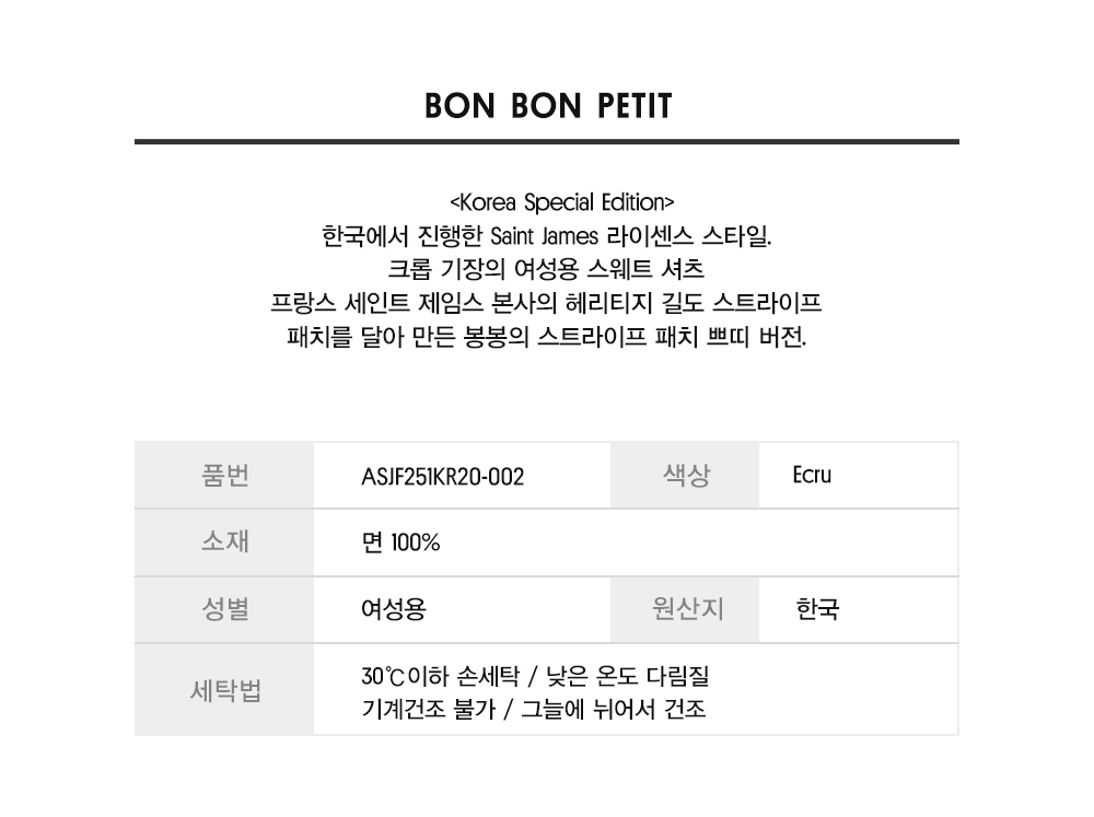세인트제임스(SAINT JAMES)는 1889년 프랑스 노르망디 몽생미셸만 근처 세인트제임스 지역에서 시작되었습니다. 직접 만들고 염색한 털실 판매를 시작으로, 직접 만든 울로 레옹 지방 어부들을 위한 셔츠를 공급하며 1929년 회사를 설립하였고, 이후 마린 룩의 대명사로 성장하였습니다.