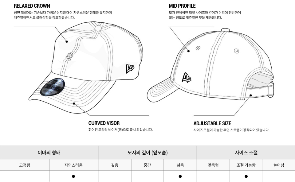 9TWENTY란 모자의 크라운 부분이 부드러운 심지로 제작되어 자연스러운 형태를 가진 모델입니다. 기본적인 모양은 9FORTY USTRUCTURED와 같으며, 6면의 패널과 타원형으로 구부러져 있는 챙으로 구성되어 있습니다. 안정적인 깊이감과 형태, 자연스러운 커브드 바이저로 부담 없이 착용 가능합니다. 제품의 안쪽 자체 개발된 Sweat 밴드는 탁월한 땀 흡수력과 착용감을 제공합니다.