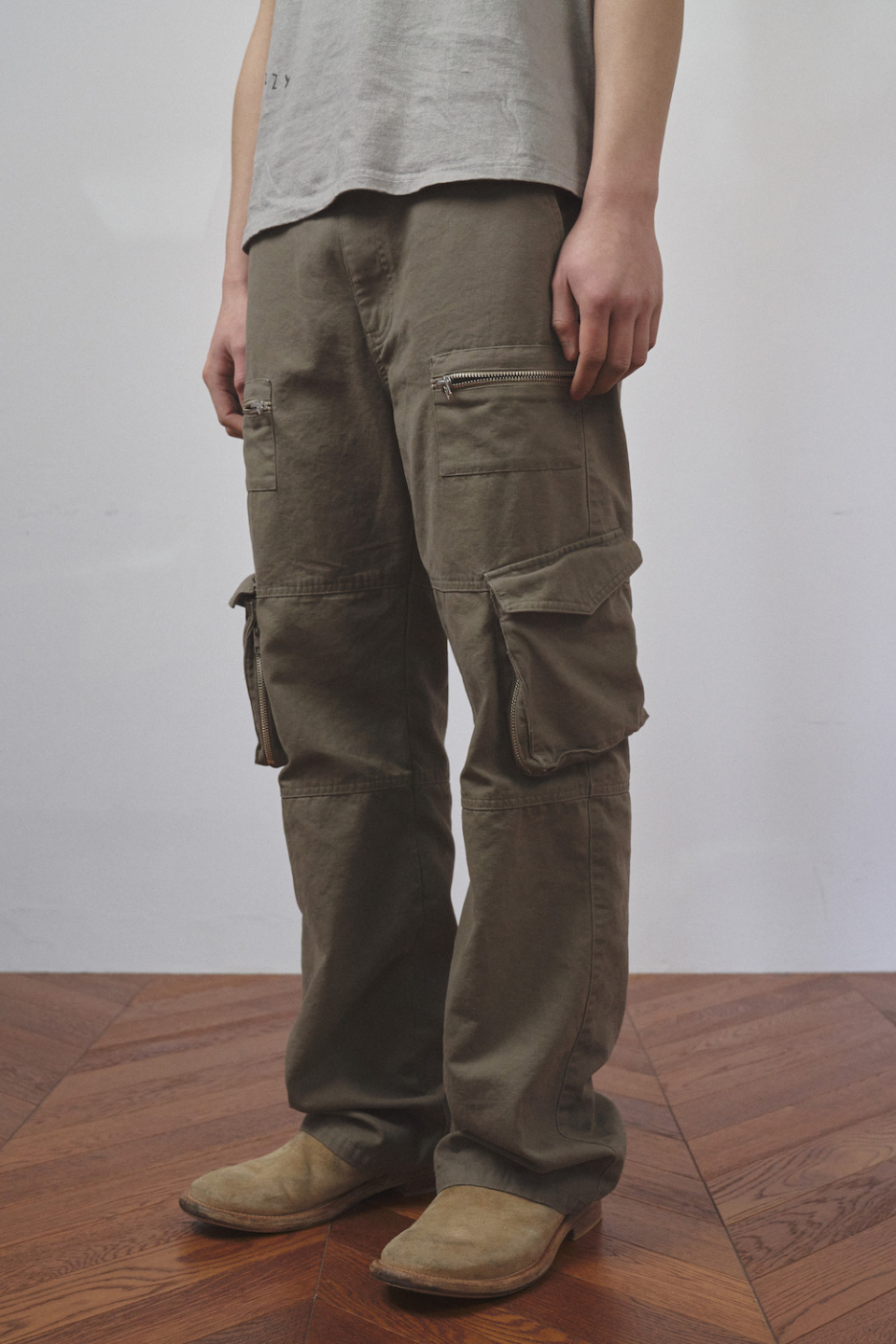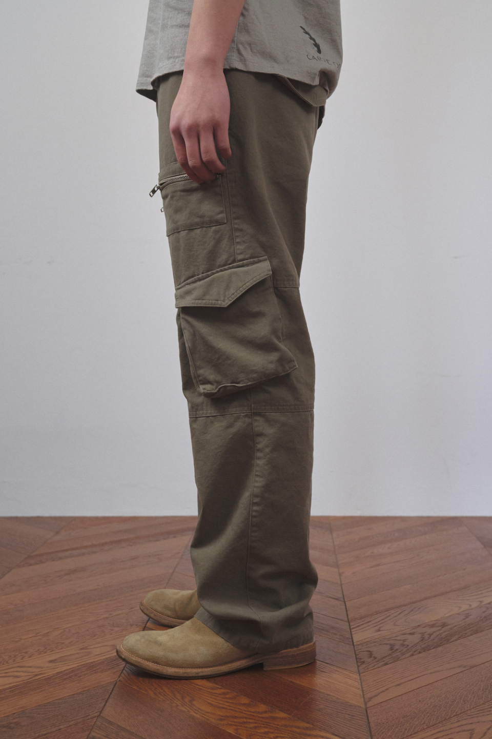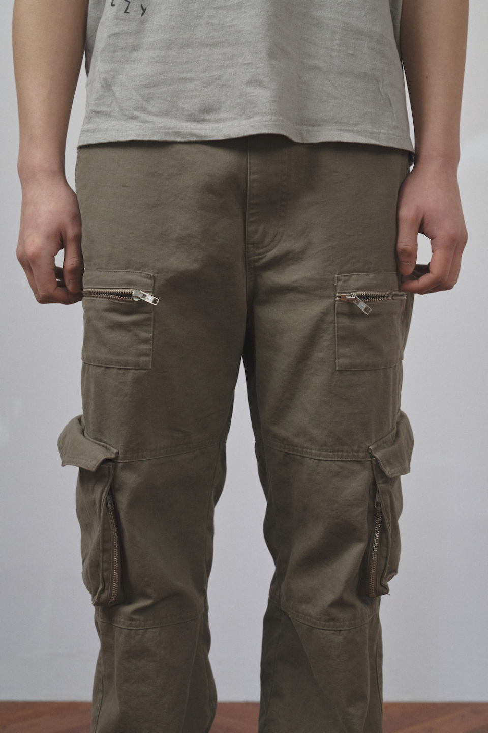카고팬츠의 입체분량에 위치한 지퍼와 상단에 위치한 패치포켓 지퍼를 통해 독특한 외관을 보여줍니다
