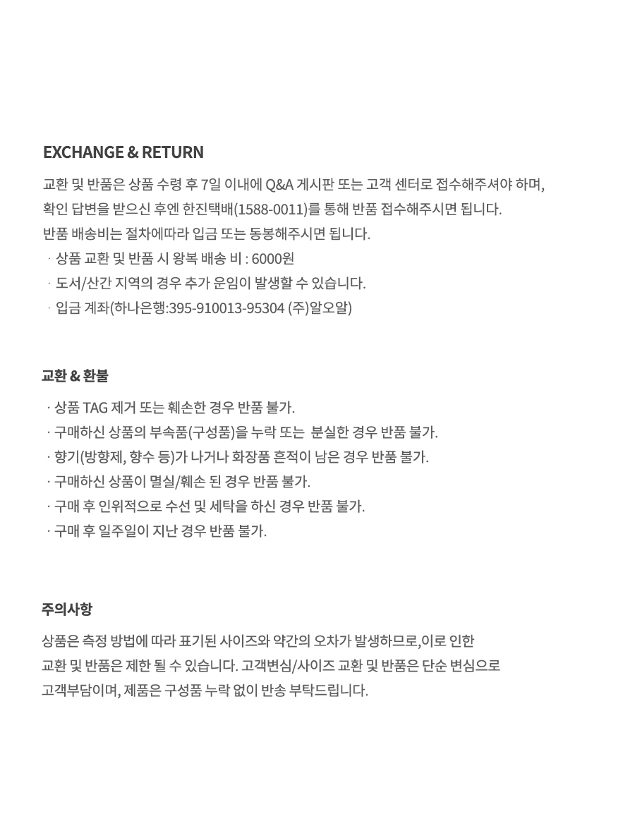 어두운 컬러 착용 시 마찰에 의해 이염의 우려가 있으니, 밝은색의 타제품 착용을 주의하시길 바랍니다.