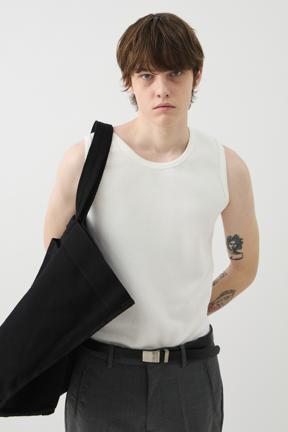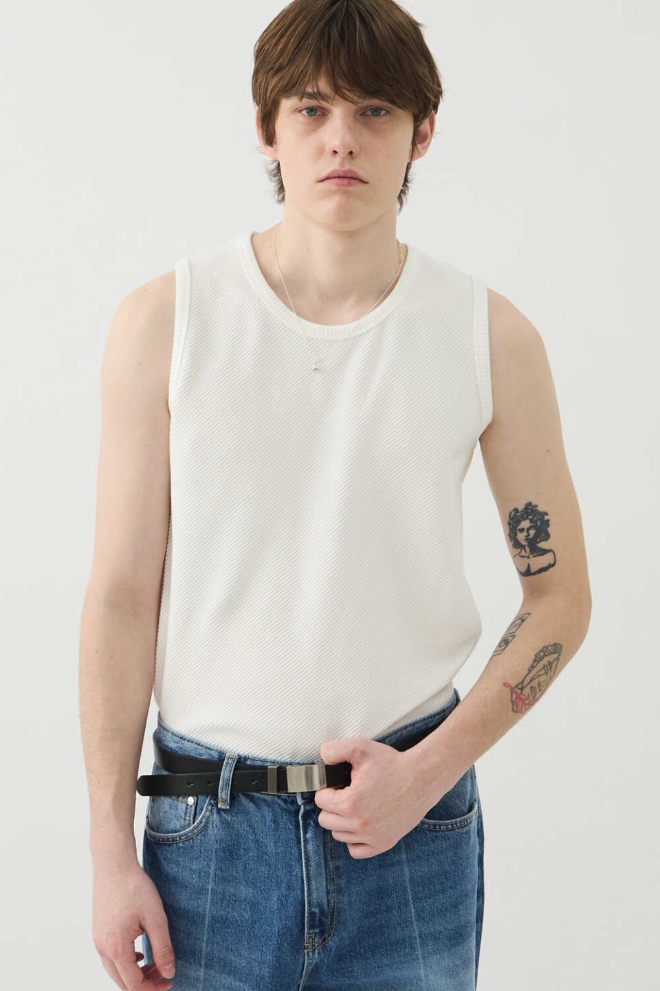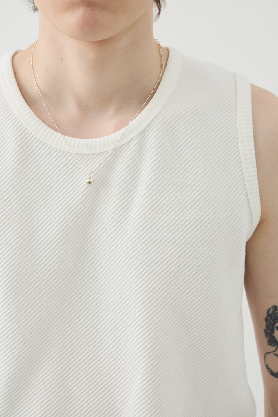 -사선 립소재로 세련된 무드로 연출되는 슬리브리스 탑